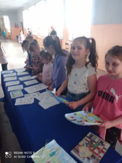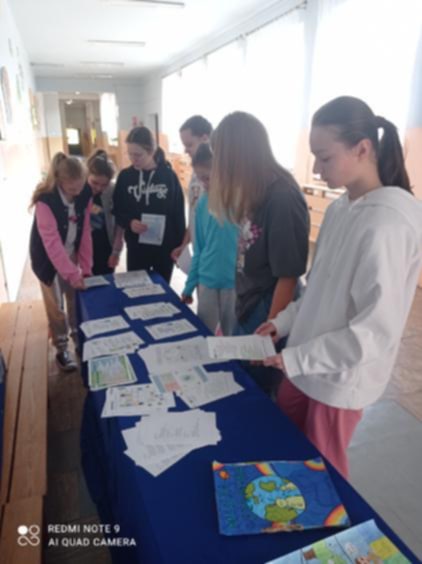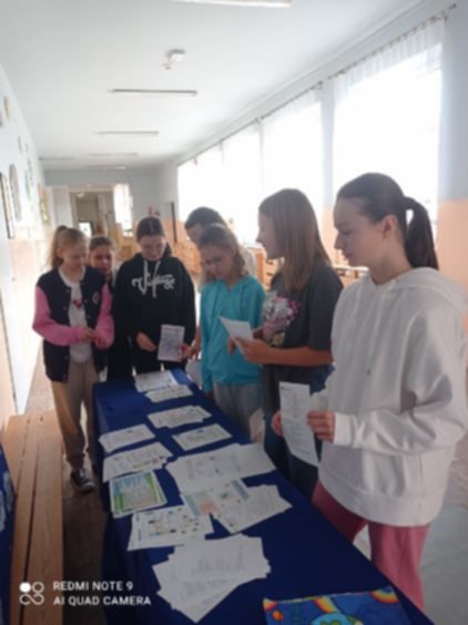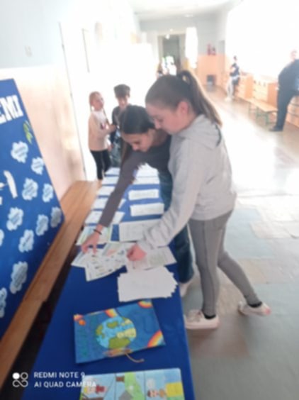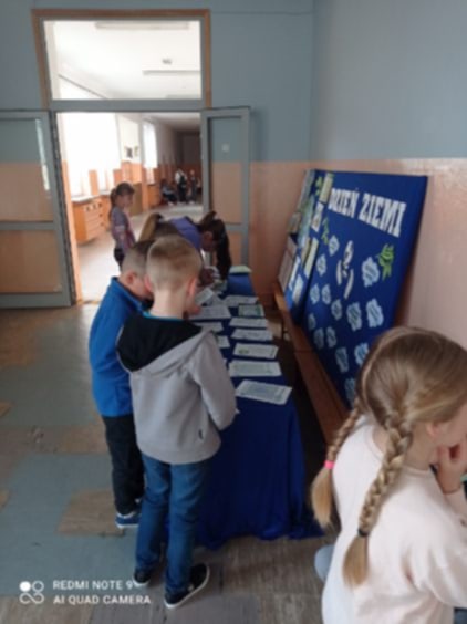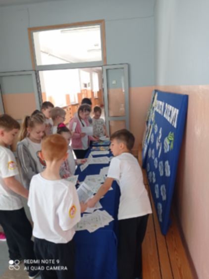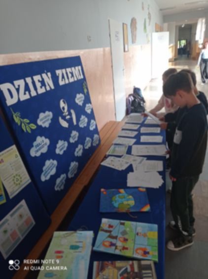 Na górnym korytarzu przygotowano szkolne stoisko ekologiczne – gazetki związane z tematyką ochrony środowiska oraz plakaty, gry planszowe, ulotki, książeczki i zadania dla uczniów: quizy, krzyżówki, ekokodowania, plątaninki, sudoku, kolorowanki.