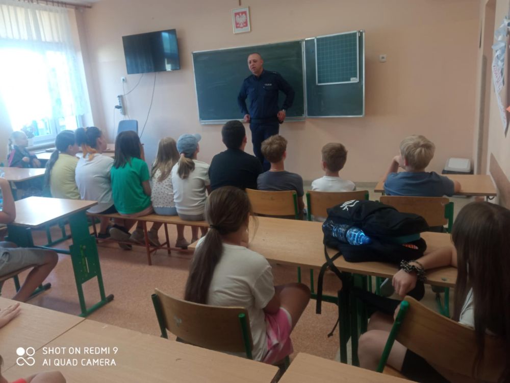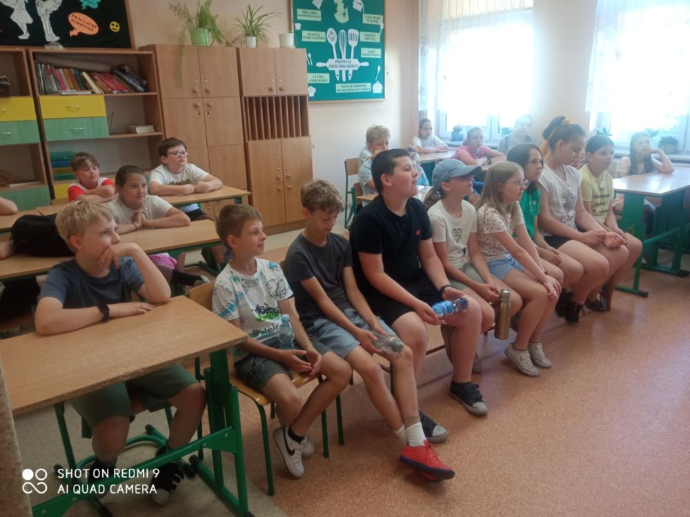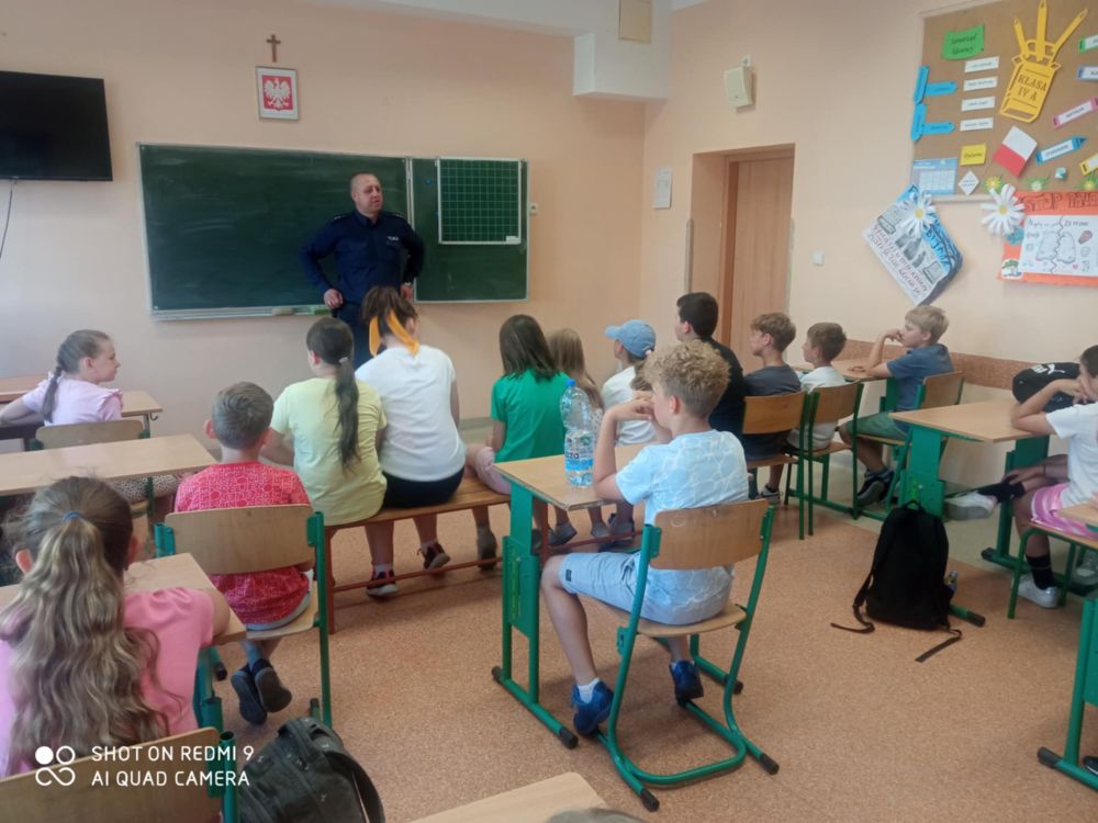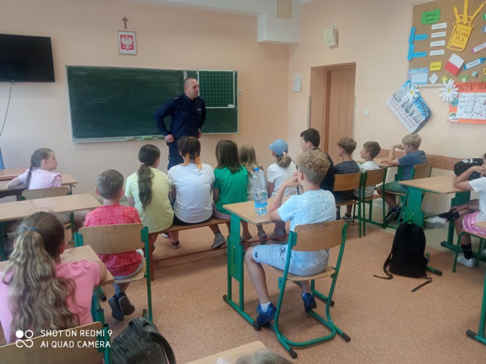 Podczas spotkania Pan Policjant podkreślił również ogromne znaczenie noszenia elementów odblaskowych. Uczniowie aktywnie uczestniczyli w spotkaniu, słuchając i zadając pytania związane z tematem bezpieczeństwa.