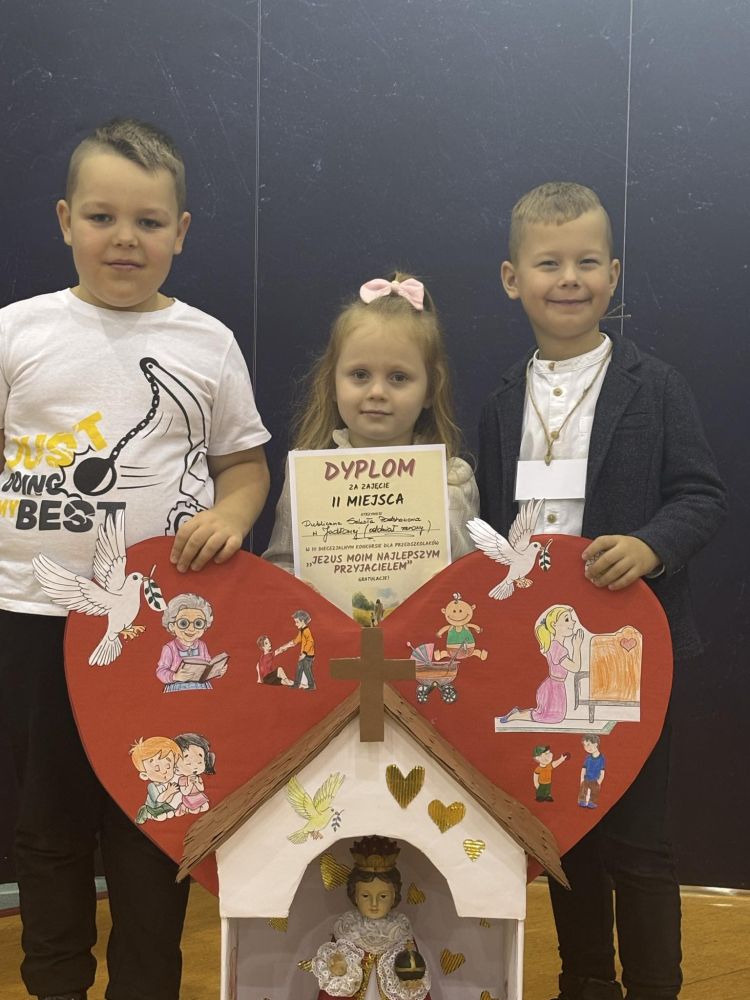 Naszą szkołę reprezentowało troje dzieci: Patrycja Wiatr, Dawid Kaczka i Mikołaj Pytlik. Zmagania konkursowe podzielone były na 3 części. Najpierw dzieci prezentowały pracę wykonaną przy pomocy rodziców i recytowały wierszyk pt. "Na jodłowskiej ziemi". Następnie rozwiązywały test wiedzy obejmujący zagadnienia przyjaźni z Panem Jezusem. Ostatnią część stanowiło wymalowanie serca z Jezusem i barankiem. Po zakończeniu wszystkich etapów konkursu jury ogłosiło wyniki. Najmłodsi przedstawiciele naszej szkoły zajęli II miejsce.