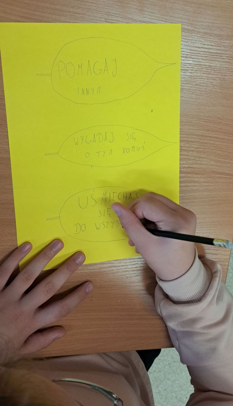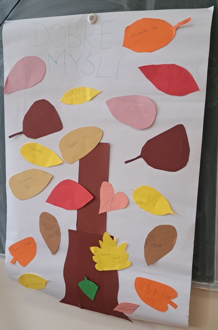 Na godzinach wychowawczych rozmawialiśmy o empatii – co to jest, jak ją przejawiamy i okazujemy a także czym różni się ona od współczucia. Obejrzeliśmy fragmenty filmu „W głowie się nie mieści” prezentujący empatyczną postawę bohaterów. Omówiliśmy ich postępowanie. Wypisaliśmy dobre myśli na własnoręcznie wyciętych kolorowych liściach oraz zrobiliśmy drzewko Dobrych Myśli.