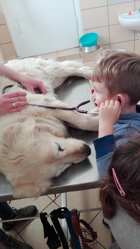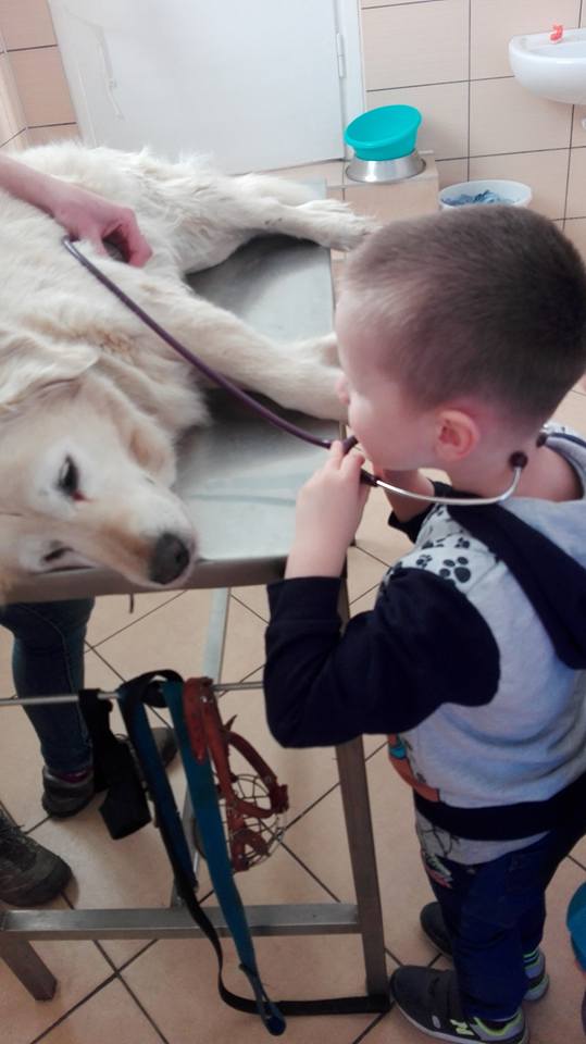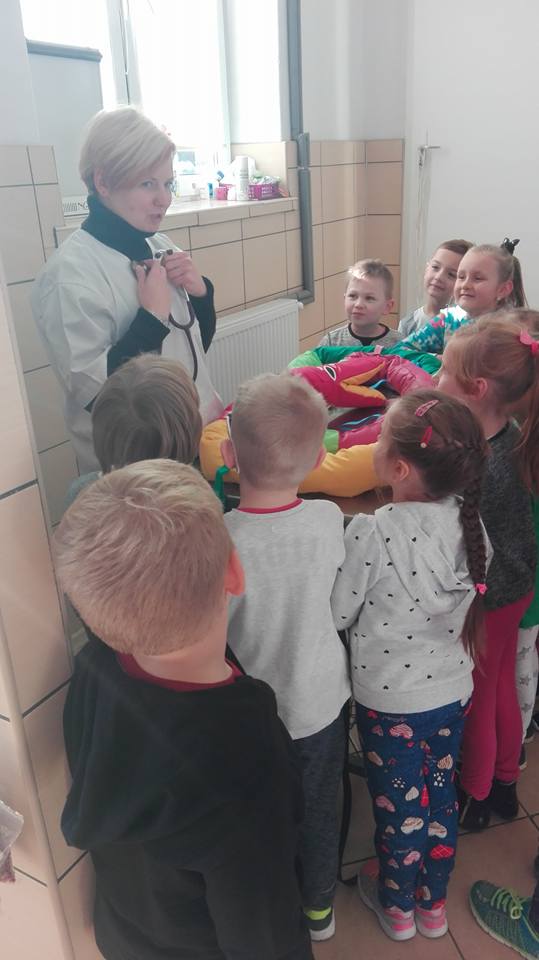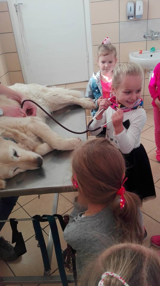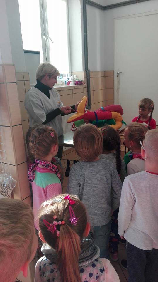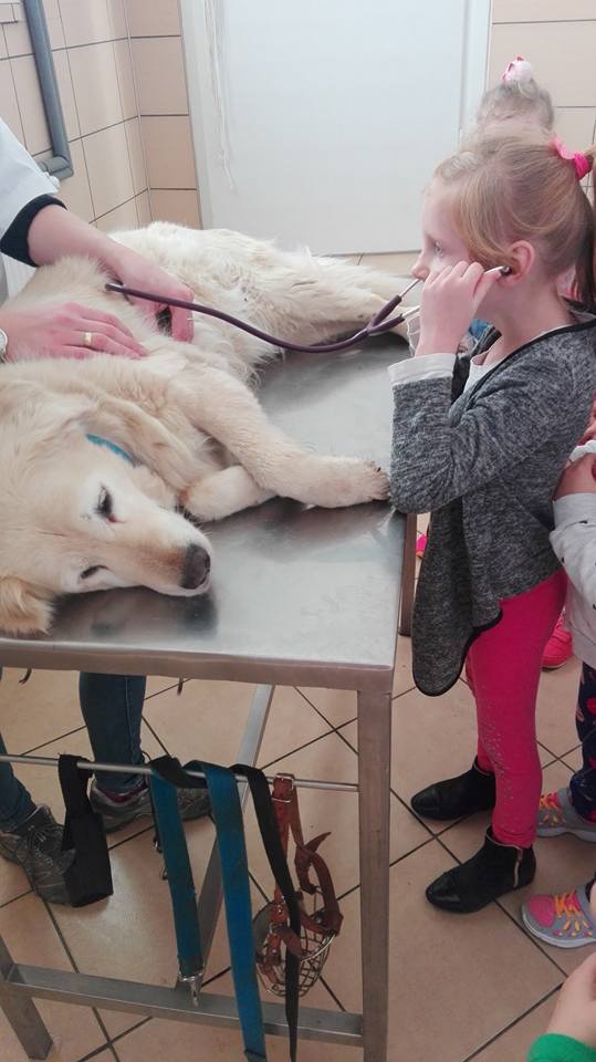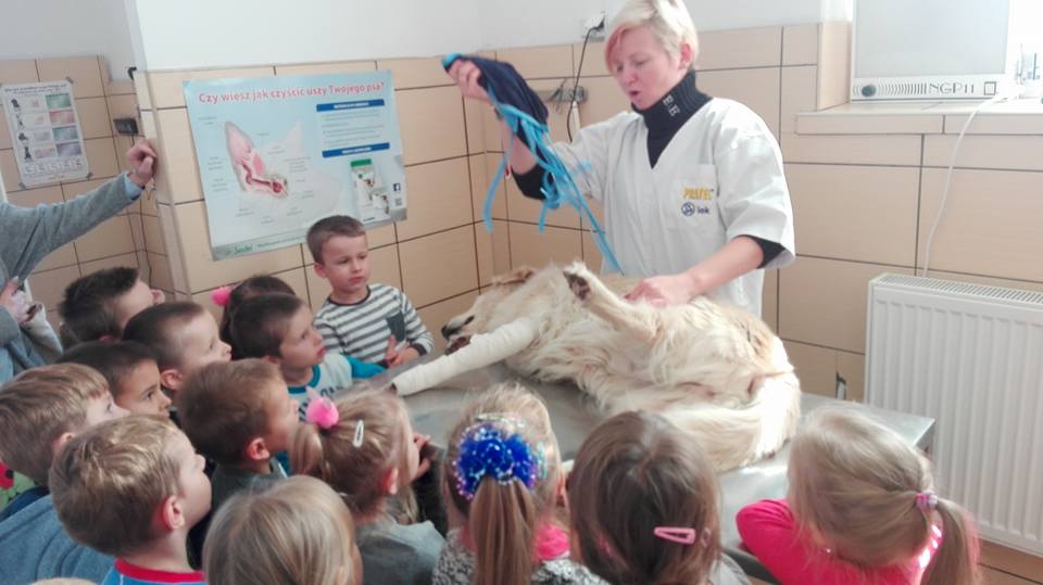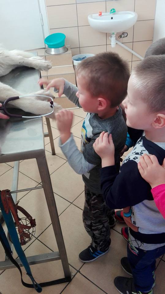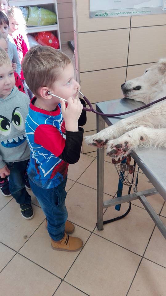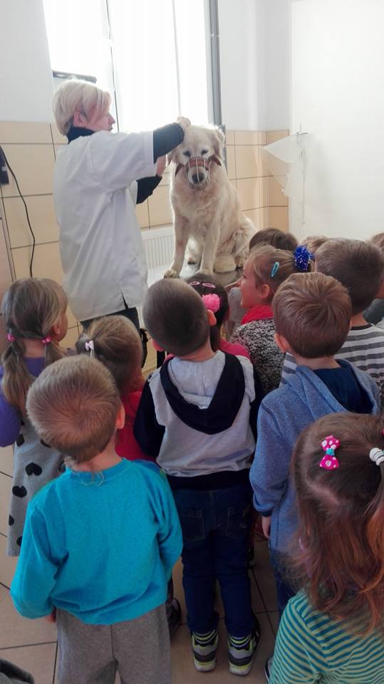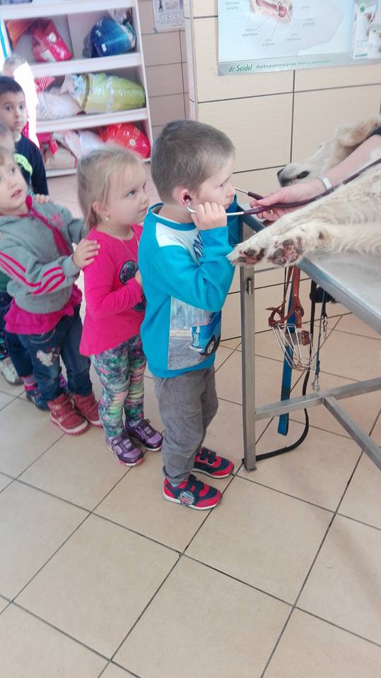 Przedszkolaki dokładnie obejrzały gabinet weterynaryjny, dowiedziały się na czym polega praca weterynarza. Pani doktor weterynarii opowiedziała o sposobie pielęgnacji zwierząt domowych, pokazała jak bada się i leczy zwierzęta, a także jak należy się zachować podczas kontaktu z niebezpiecznym zwierzęciem. Dzieci poznały narzędzia medyczne potrzebne do badania zwierząt. Z wielkim zaciekawieniem oglądały wszystkie pomieszczenia gabinetu. Pani weterynarz opowiedziała do czego służą znajdujące się w nich urządzenia. Dzieci poznały urządzenie do badania USG, stetoskop, stół do zabiegów operacyjnych. Dzieci brały aktywny udział w spotkaniu i chętnie opowiadały o swoich małych przyjaciołach i ich problemach ze zdrowiem. Pani weterynarz podkreśliła konieczność mycia rąk po każdym kontakcie ze zwierzętami.