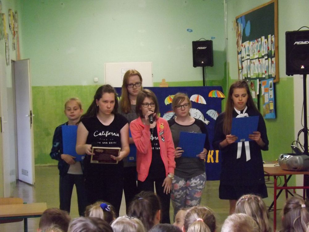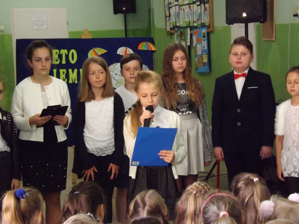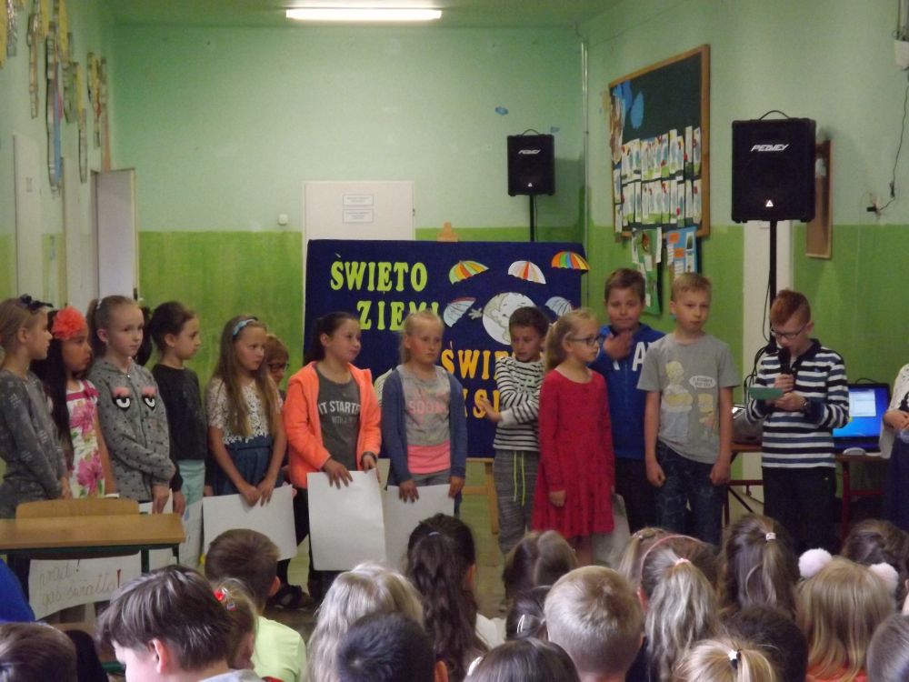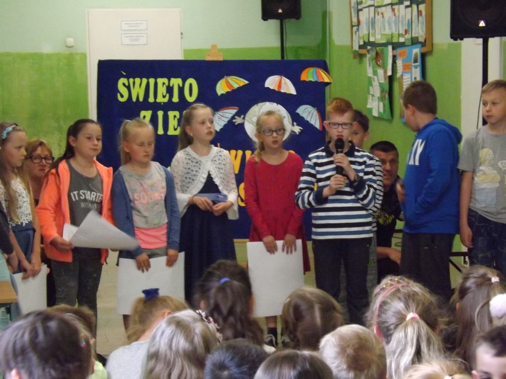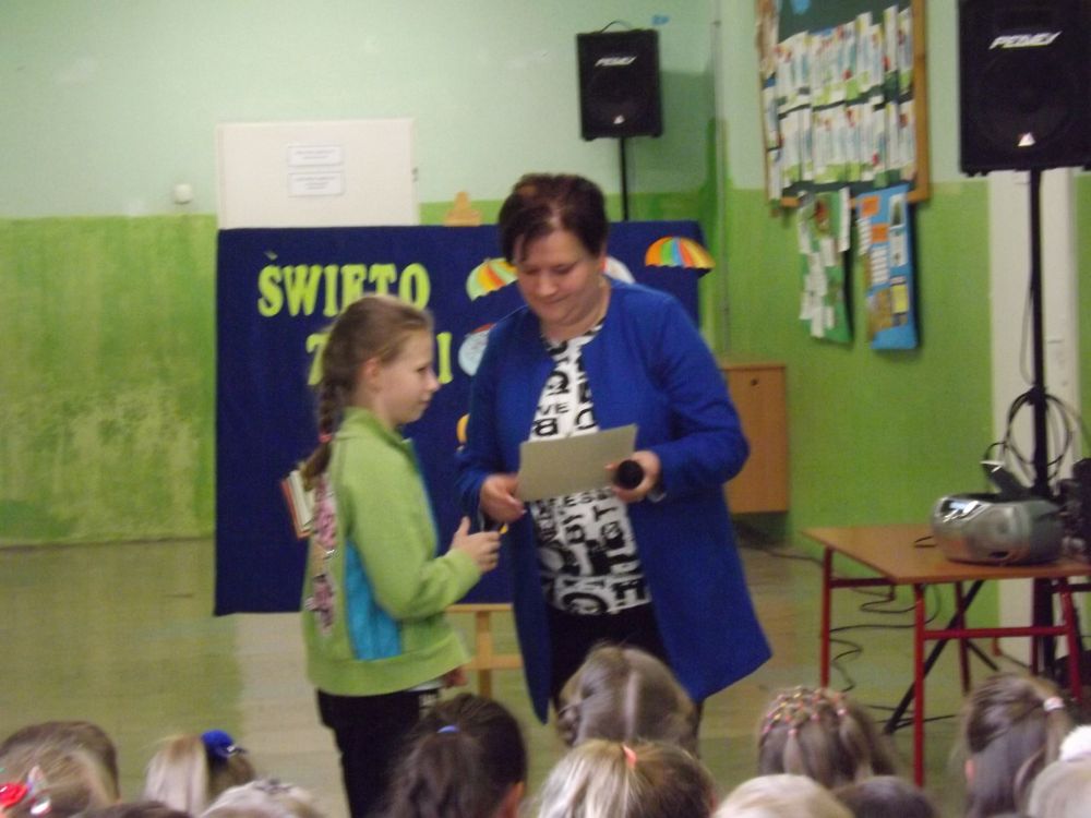 Ponadto uczniowie klas IV- VI z okazji Dnia Ziemi wzięli udział w rozwiązywaniu krzyżówek ekologicznych. Odbyło się losowanie nagród, które przeprowadziła Pani Dyrektor spośród dobrze uzupełnionych krzyżówek. Głównymi nagrodami były książki. Ponadto wręczono również nagrody pocieszenia. Na specjalnej wystawce uczniowie mieli okazję obejrzeć albumy o parkach narodowych wykonanych przez uczniów klasy piątej i ulotek o szkodliwości palenia papierosów i picia alkoholu w wykonaniu klas czwartych. Na zakończenie uroczystości klasa IIIa przygotowała quiz ekologiczny dla uczniów klas I – III. Za prawidłowe odpowiedzi uczniowie otrzymywali nagrody przygotowane przez uczniów tej klasy Były to piękne motyle, osy, pszczoły, biedronki. Wszyscy uczniowie zaangażowani byli w udzielanie odpowiedzi. Cała uroczystość miała wyjątkowy i niepowtarzalny charakter.