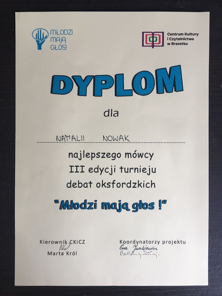 Temat, który wybrany został do finałowej dyskusji o III miejsce brzmiał: „Środowisko wychowuje bardziej niż rodzina”. Nasi uczniowie byli po stronie propozycji i obronili tezę, pokonując gimnazjalistów ze Strzegocic.