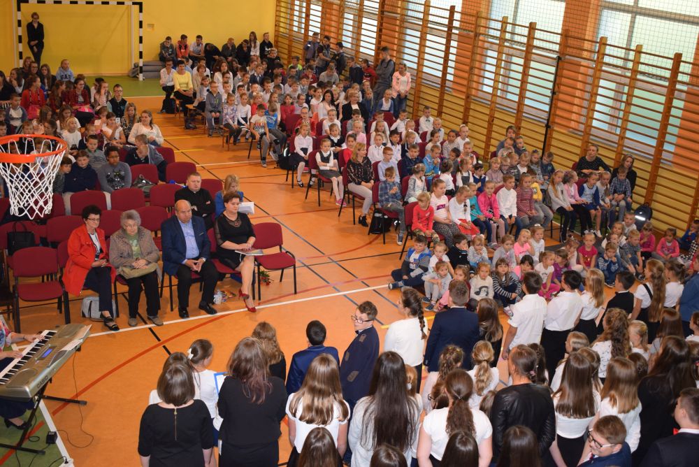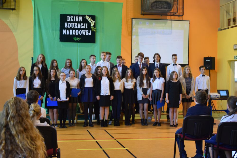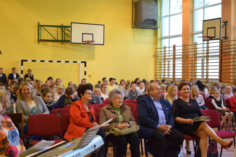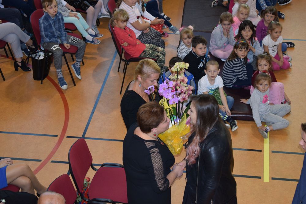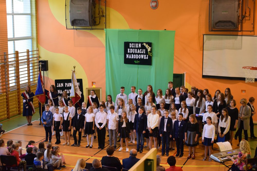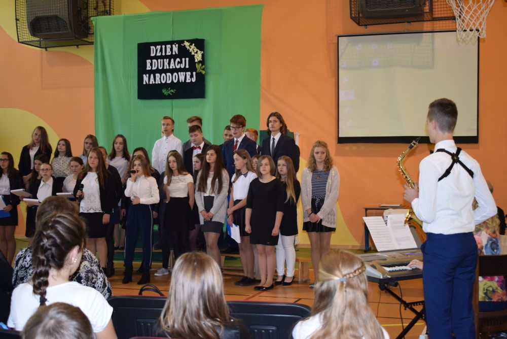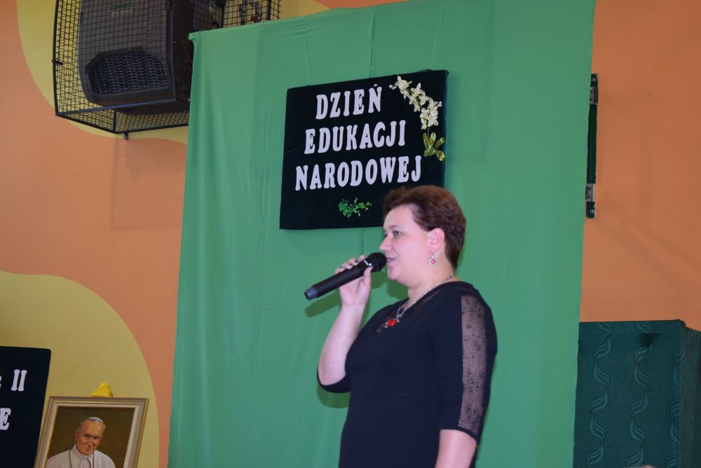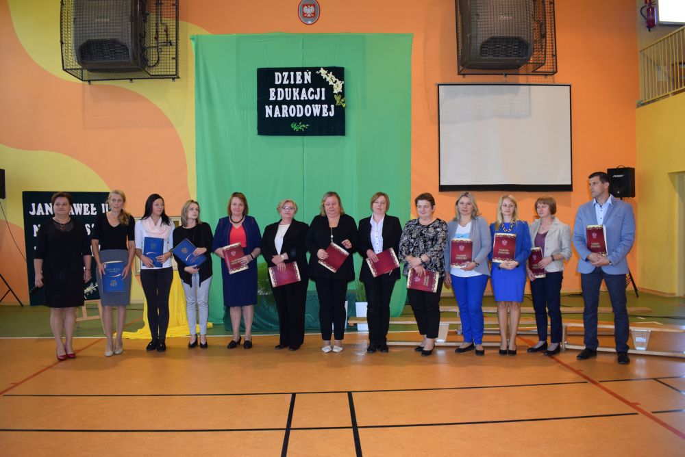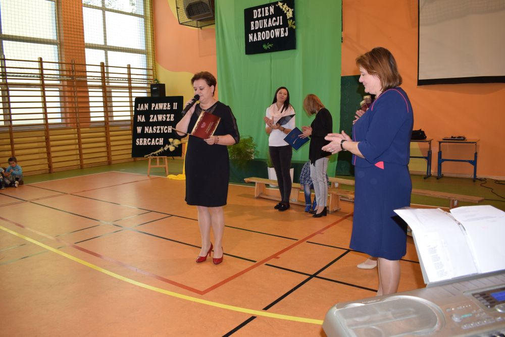 Po przerwie spotkaliśmy się ponownie, tym razem na akademii z okazji „Dnia Edukacji Narodowej”. Uczniowie Szkoły Podstawowej, z pomocą Pań: Jolanty Głaz i Marii Warzechy, przygotowali część artystyczną, podczas której w zabawny sposób przedstawili realia szkolnego życia i podziękowali nauczycielom za ich pracę. O oprawę muzyczną zadbała Pani Lena Goleń wraz ze swoimi podopiecznymi ze szkolnego chóru. Życzenia skierowane do Dyrekcji oraz Grona Pedagogicznego Szkoły odczytali przedstawiciele Samorządu Szkolnego. Do nauczycieli zwróciła się też w swoim przemówieniu Dyrektor naszej Szkoły, Pani Aneta Janaś. Pani Dyrektor powitała również przybyłych na uroczystość gości – emerytowanych nauczycieli i pracowników obsługi, a także wręczyła zasłużonym nauczycielom tegoroczne Nagrody Dyrektora, a szczególnie wyróżniającym się w nauce i sporcie uczniom – stypendia.