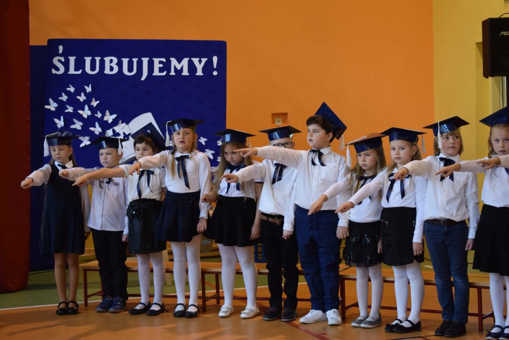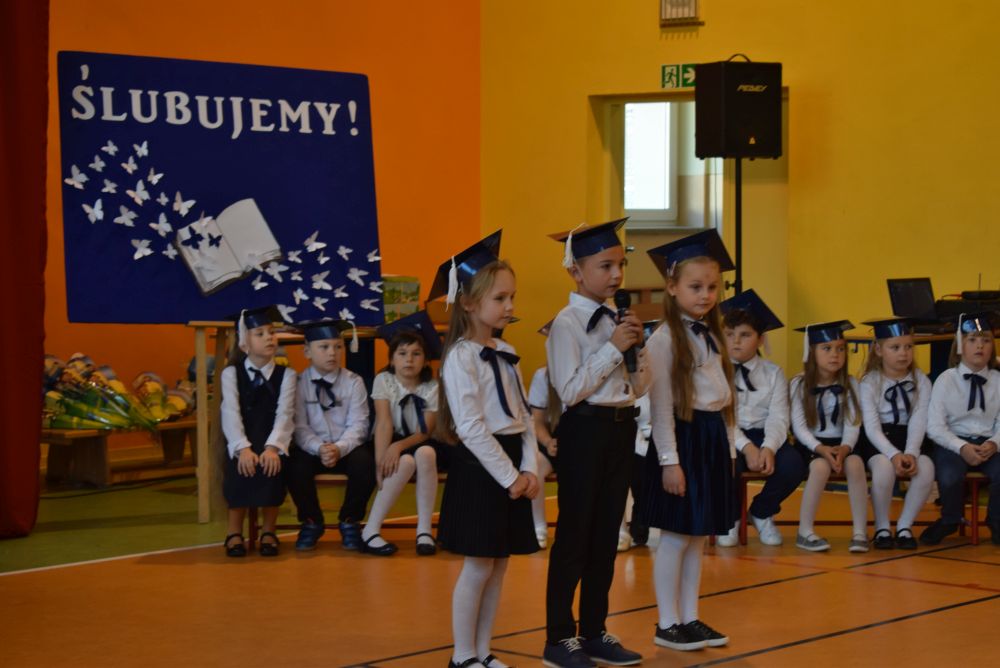 Społeczność szkoły oficjalnie powitała nowych członków braci uczniowskiej. Bohaterami uroczystości byli uczniowie klas pierwszych, lecz w tym szczególnym wydarzeniu wspierali ich swoją obecnością: dyrektor szkoły - Aneta Janaś, wicedyrektor - Alicja Mikrut, nauczyciele, rodzice oraz młodsi i starsi koledzy. Pierwszoklasiści ubrani w stroje galowe i żakowskie birety niecierpliwie oczekiwali na najważniejszy moment uroczystości - pasowanie na ucznia.