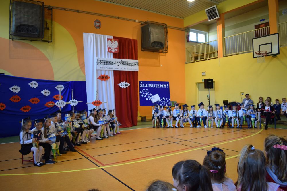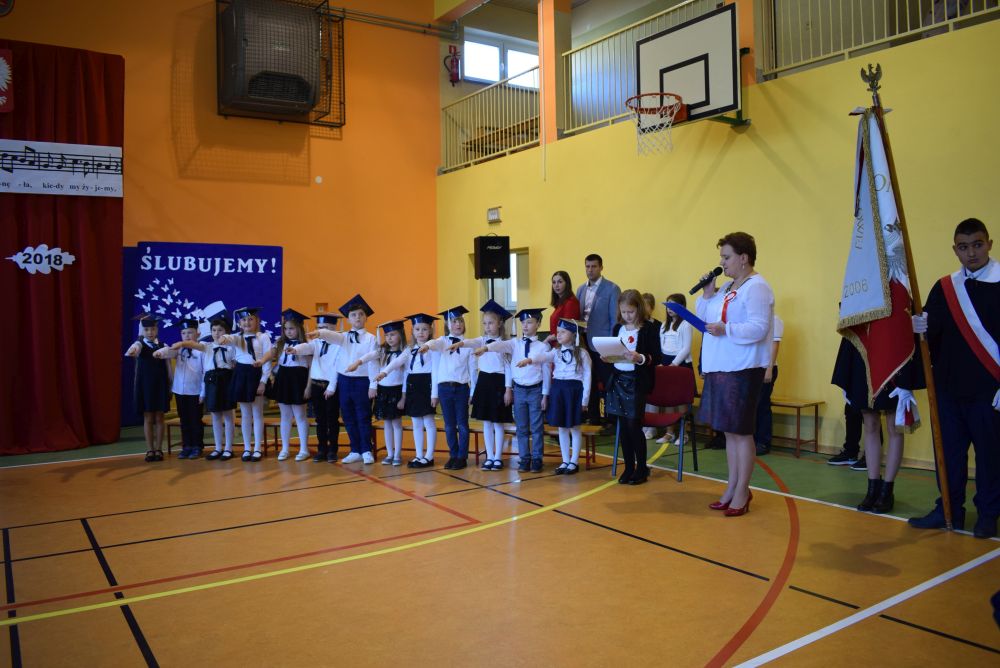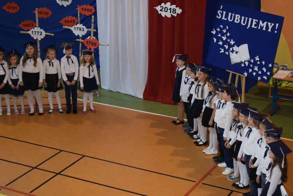 Zanim pierwszoklasiści złożyli uroczyste przyrzeczenie, zaprezentowali to, czego zdążyli się nauczyć przez czas pobytu w szkole. Uczniowie wykazali się zapałem, radością i dużym wdziękiem. Pięknie recytowali wiersze i śpiewali piosenki.