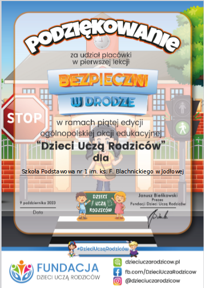 Podziękowanie dla szkoły Opublikowano: 10 październik 2023 Podziękowanie dla szkoły za udział w pierwszej lekcji "Bazpieczni w drodze"w ramach akcji "Dzieci uczą Rodziców".