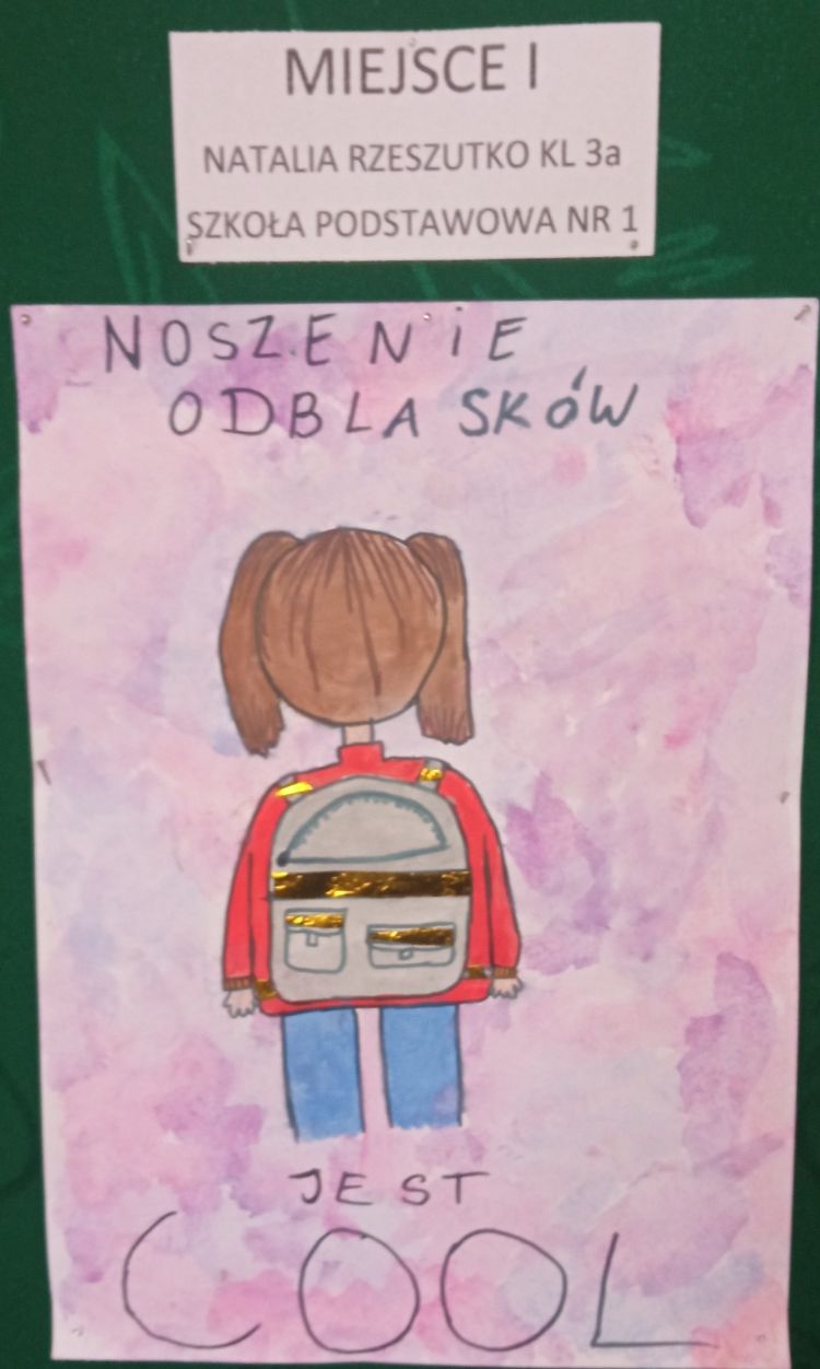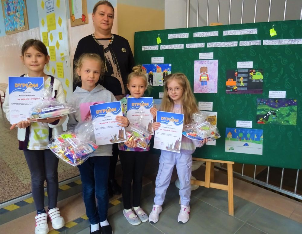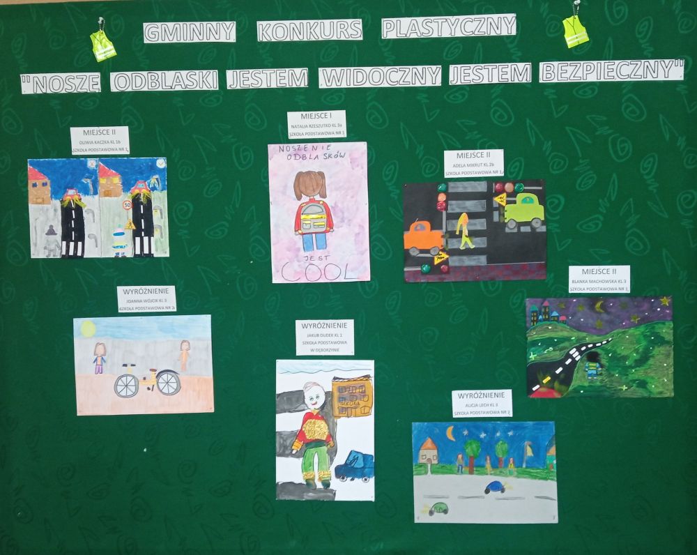 Od 19 września do 3 października 2023r. w ramach programu "Odblaskowa szkoła" trwał Gminny Konkurs Plastyczny "NOSZĘ ODBLASKI - JESTEM WIDOCZNY - JESTEM BEZPIECZNY", który promował noszenie elementów odblaskowych mających istotny wpływ na bezpieczeństwo pieszych. Celem konkursu było zachęcanie dzieci do przedstawienie własnego, kreatywnego pomysłu na zwiększenie bezpieczeństwa na drodze oraz propagowanie idei noszenia odblasków. Ocenie podlegały następujące kryteria: samodzielność wykonania pracy, zgodność z tematyką, oryginalność pracy, ogólne wrażenia estetyczne.