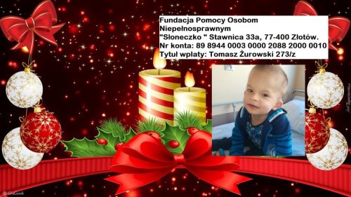 4 letni Tomuś Żurowski urodził się jako wcześniak z niedotlenieniem i infekcją wrodzoną. Po dalszych badaniach zdiagnozowano u niego wodogłowie i astmę oskrzelową. Przeprowadzone w tym roku badania w szpitalu w Prokocimiu wykazały, że Tomek cierpi na zespół wad genetycznych. Rozwój psychoruchowy Tomka jest bardzo opóźniony na chwile obecną nie siedzi, nie chodzi i nie mówi. Od czwartego miesiąca życia rozpoczął intensywną rehabilitację ruchową, terapię logopedyczną i psychologiczną. Wierzymy, że dzięki fachowej pomocy Tomuś będzie miał szansę normalnie funkcjonować.