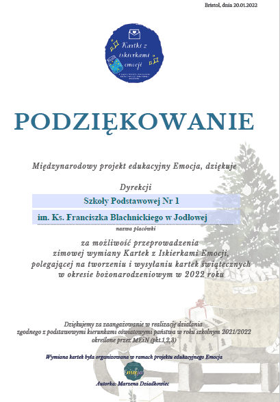 Zimowa wymiana kartek z Iskierkami Emocji Opublikowano: 25 styczeń 2022 Podziękowanie dla Dyrekcji Szkoły za zimową wymianę "Kartek z Iskierkami Emocji" w okresie bożonarodzeniowym.