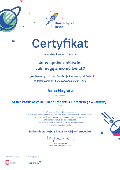Uczniowie klasy Va uczestniczyli w projekcie: Ja w społeczeństwie. Jak mogę zmienić świat? zorganizowanym przez Fundację Uniwersytet Dzieci. Podczas zajęć uczniowie analizowali takie wartości, jak: odpowiedzialność, tolerancja czy wsparcie innych. Dzięki projektowi rozwinęli wrażliwość na potrzeby wspólnoty lokalnej oraz znajomość powszechnie przyjętych zasad. Uczniowie budowali także postawę świadomego uczestnictwa i twórczego zaangażowania w życie społeczne.