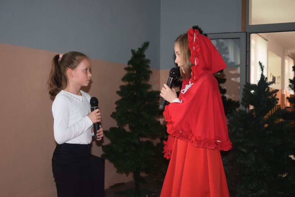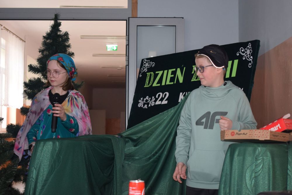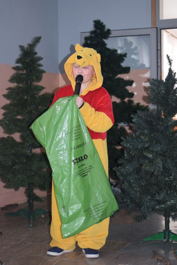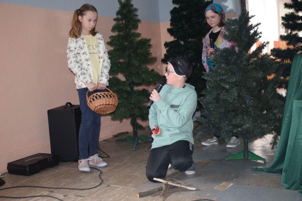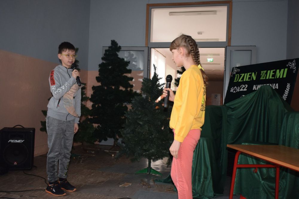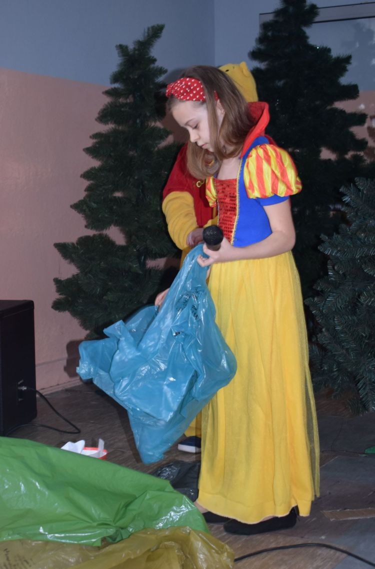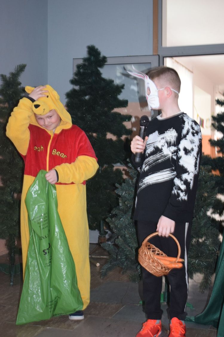 Z tej okazji uczniowie klasy IV przygotowali krótkie inscenizacje „W bajkowym świecie ekobohaterów”. Kolejno na scenie pojawiali się: Księżyc, Słońce, Ziemia, Kubuś Puchatek, Królik, Królewna Śnieżka oraz Jaś i Małgosia, Baba Flora.