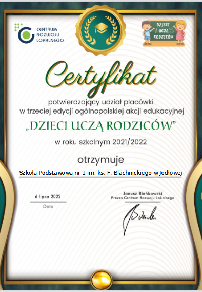 Podziękowanie za udział w trzeciej edycji "Dzieci uczą rodziów" Opublikowano: 24 sierpień 2022 Bardzo dziękujemy za udział w trzeciej edycji ogólnopolskiej akcji edukacyjnej "Dzieci uczą rodziców" w roku szkolnym 2021/2022. Z wyrazami szacunku, Dawid Wiejata koordynator ogólnopolskiej akcji edukacyjnej "Dzieci uczą rodziców"