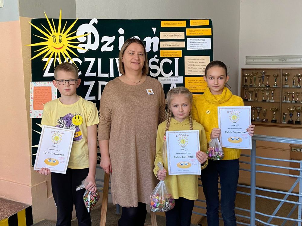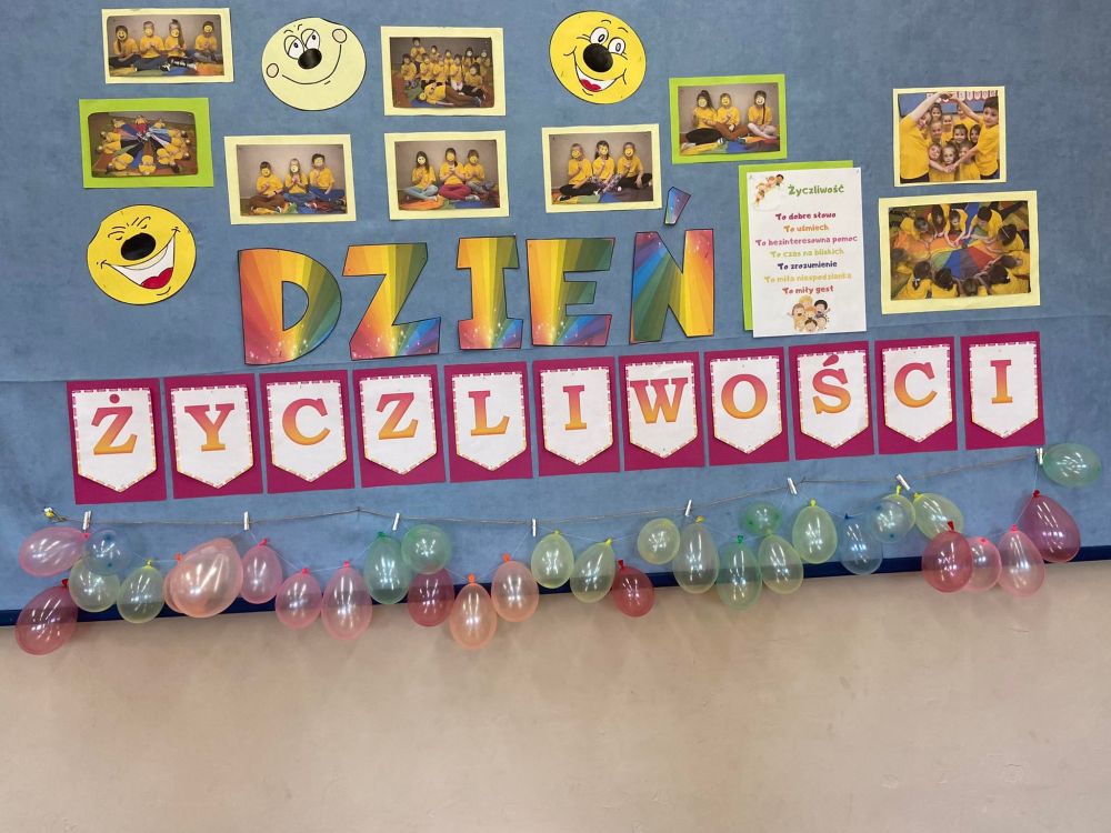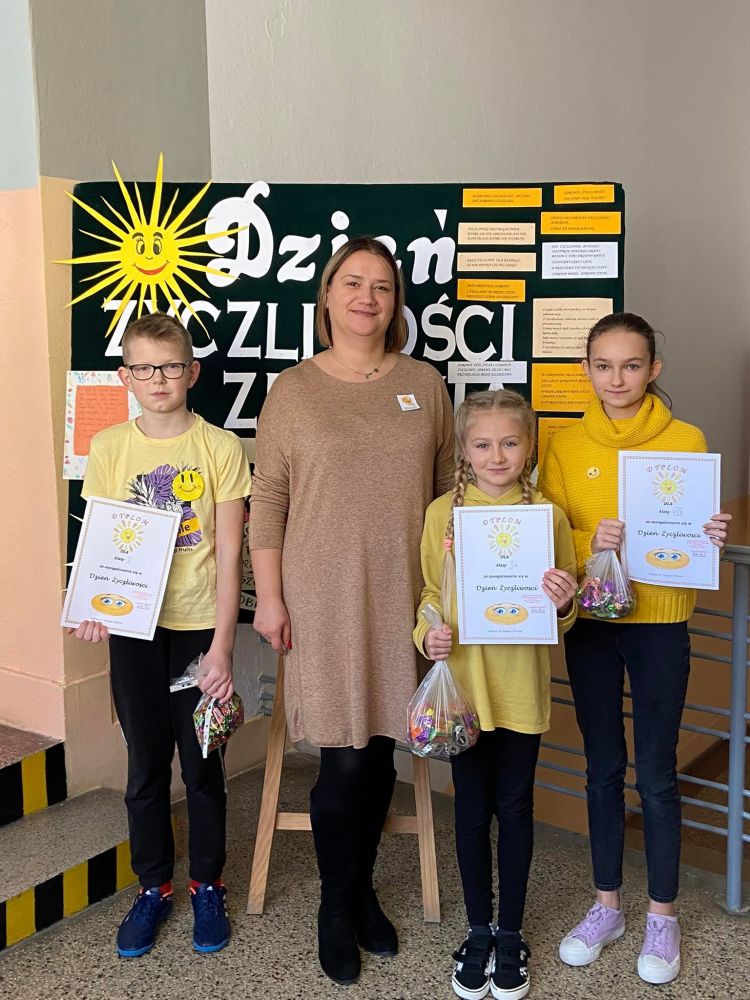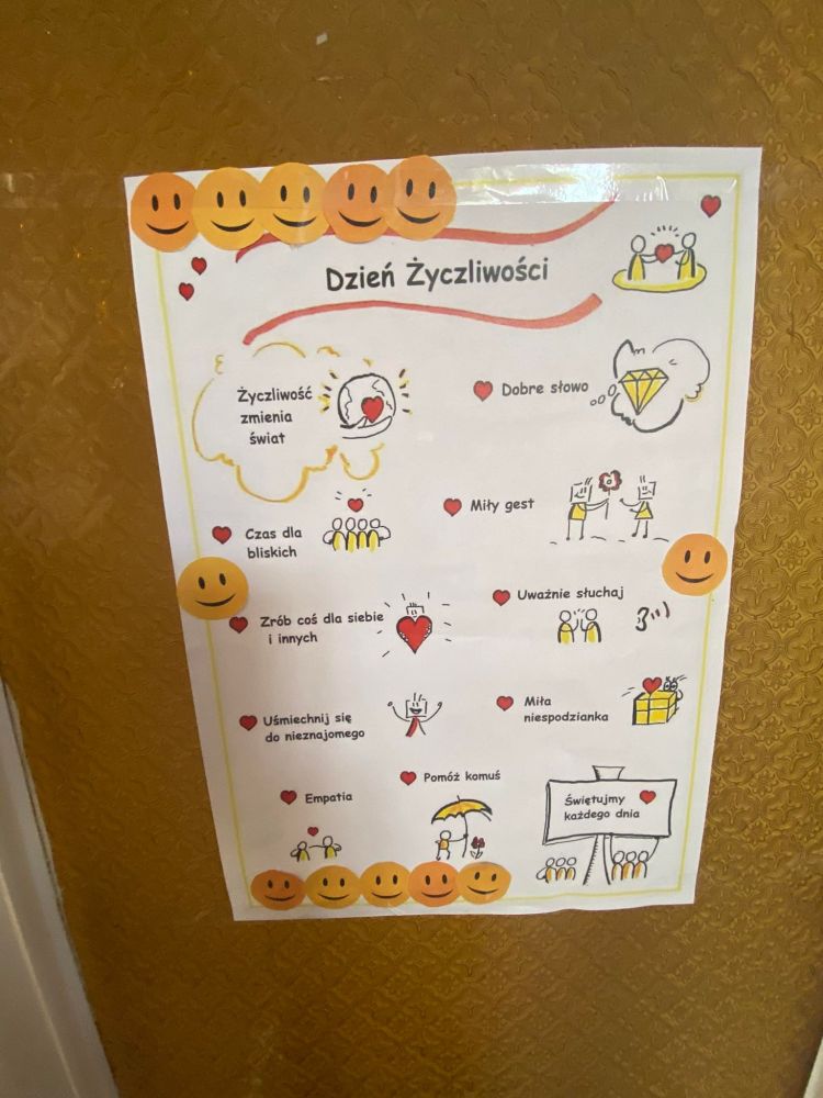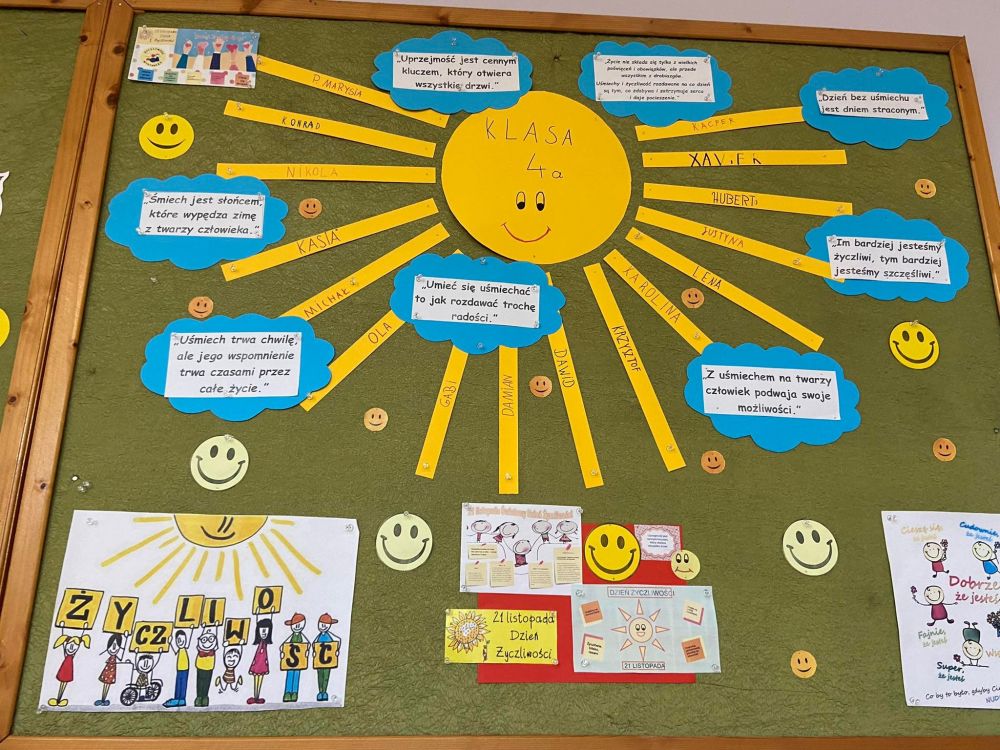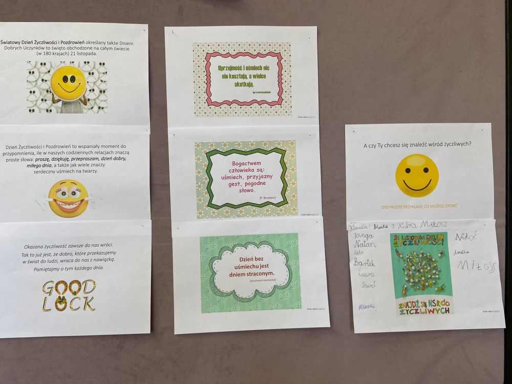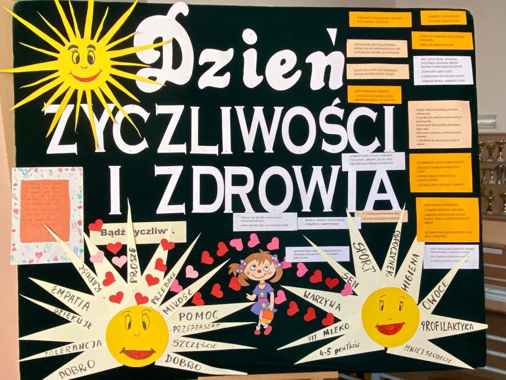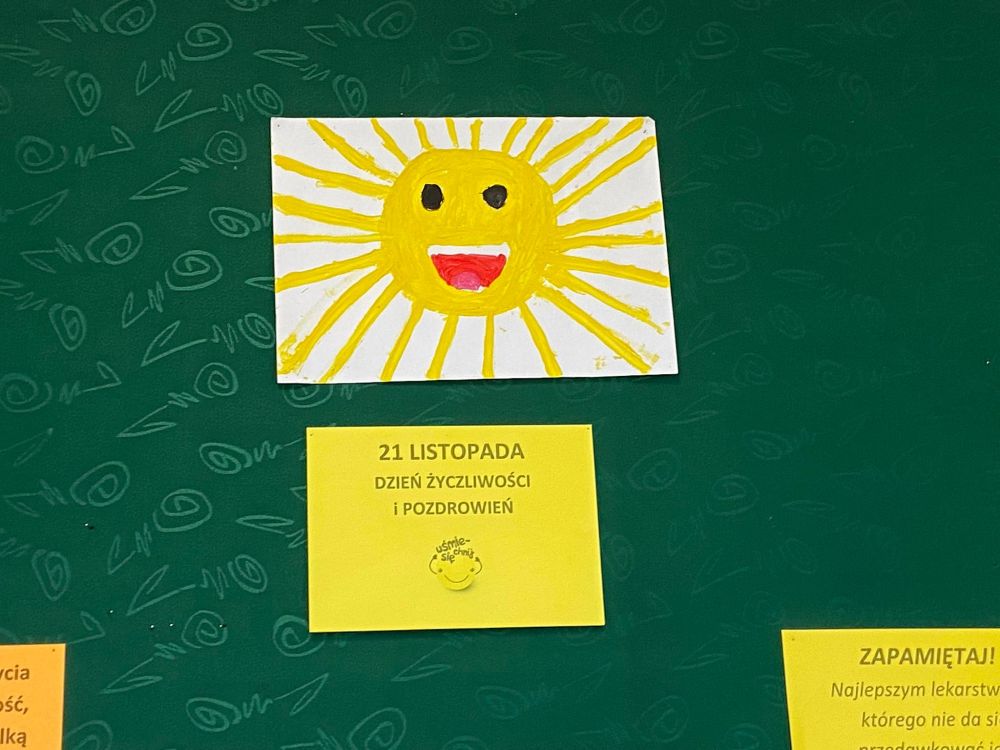 21 listopada 2022r. obchodziliśmy szkole Dzień Życzliwości, zorganizowany po raz kolejny, a połączony z dniem zdrowia. Z samego rana Pani dyrektor przez radiowęzeł złożyła wszystkim uczniom, nauczycielom i pracownikom szkoły życzenia - dużo uśmiechu i niegasnącego poczucia humoru. Szkoła została udekorowana informacjami na temat życzliwości, wesołymi minkami, cytatami i przysłowiami o dobroci, życzliwości, uśmiechu na gazetkach szkolnych. Na drzwiach każdej z klas umieszczono uśmiechnięte buźki, pozytywne i życzliwe przekazy w postaci sentencji oraz przysłów związanych z życzliwością. Ponadto przygotowano karteczki z życzeniami do oderwania i podarowania. Tego dnia uczniowie i nauczyciele ubrani byli na żółto (kolor optymizmu i radości) bądź posiadali żółte akcenty ubioru oraz radosne emblematy. W klasach odbyły się plebiscyty na najbardziej życzliwego ucznia/uczennicę czyli osobę zawsze miłą, pomocną, szanującą innych, grzeczną.
