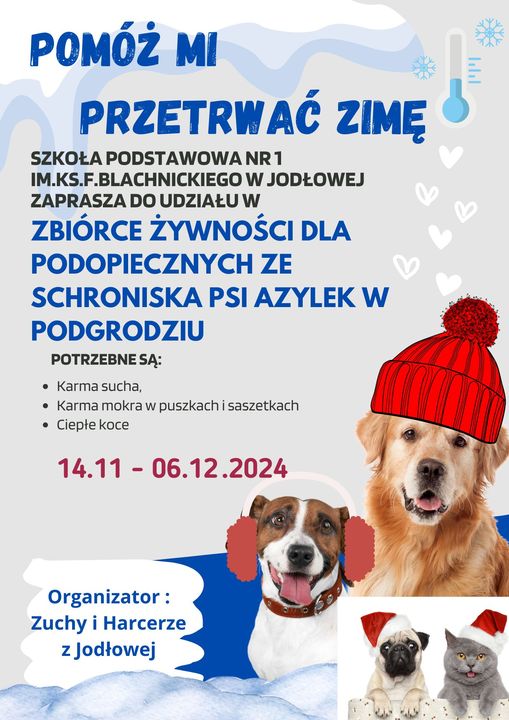 Zbiórka "Pomóż mi przetrwać zimę" Opublikowano: 13 listopad 2024 Zachęcamy do zbiórki "Pomóż mi przetrwać zimę"