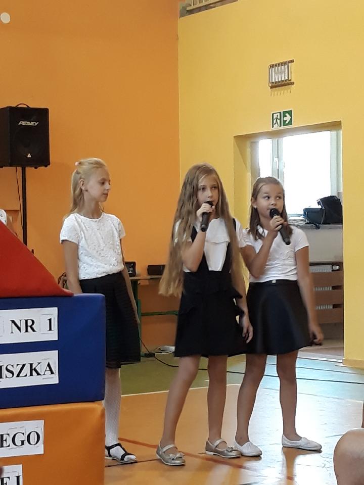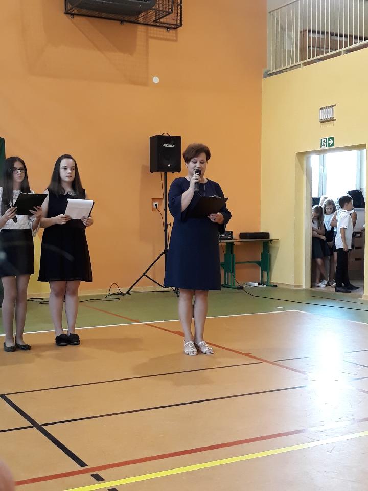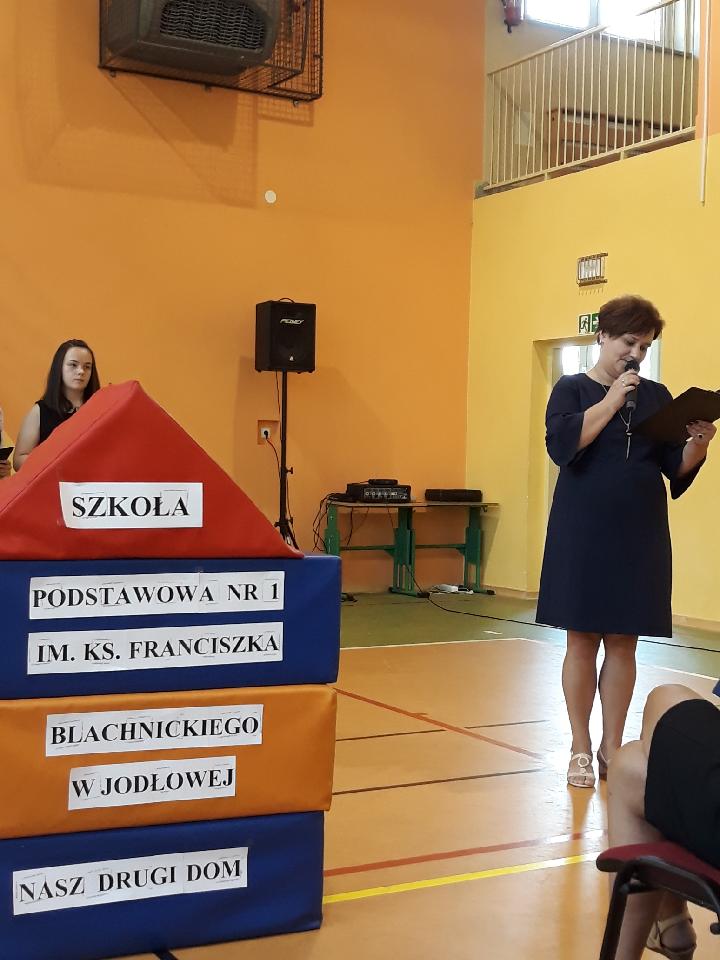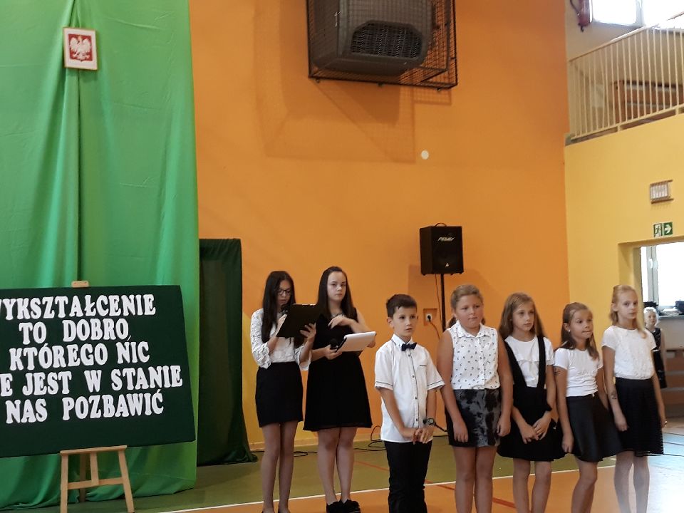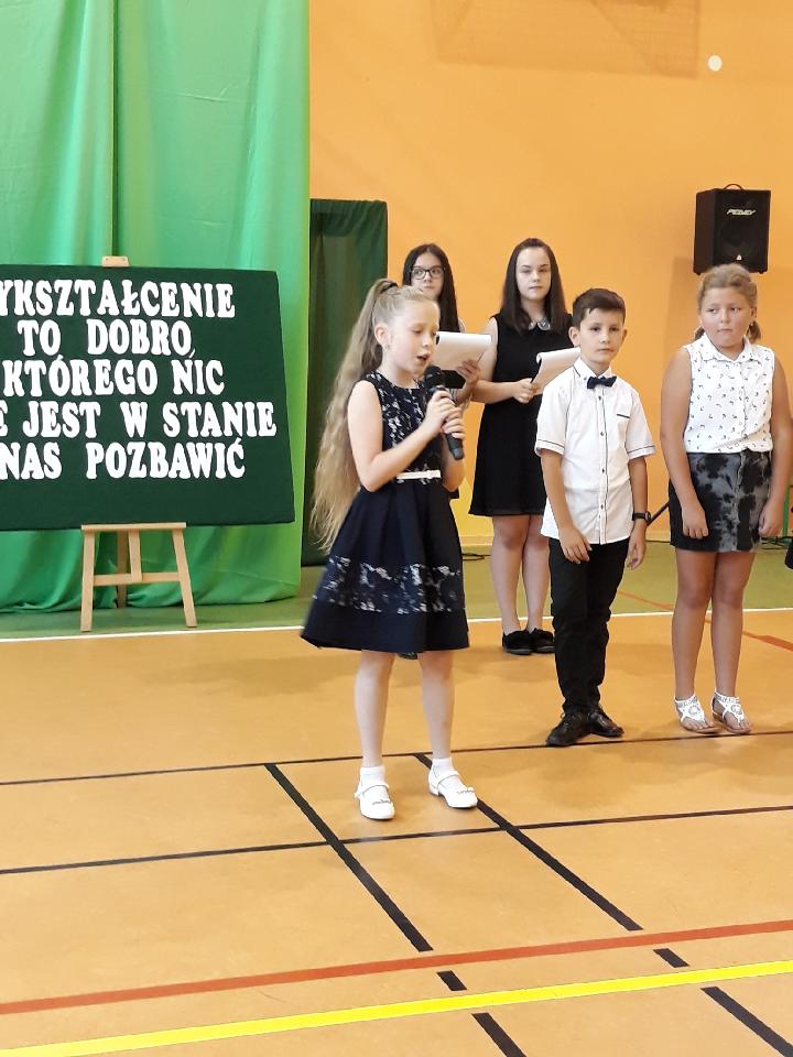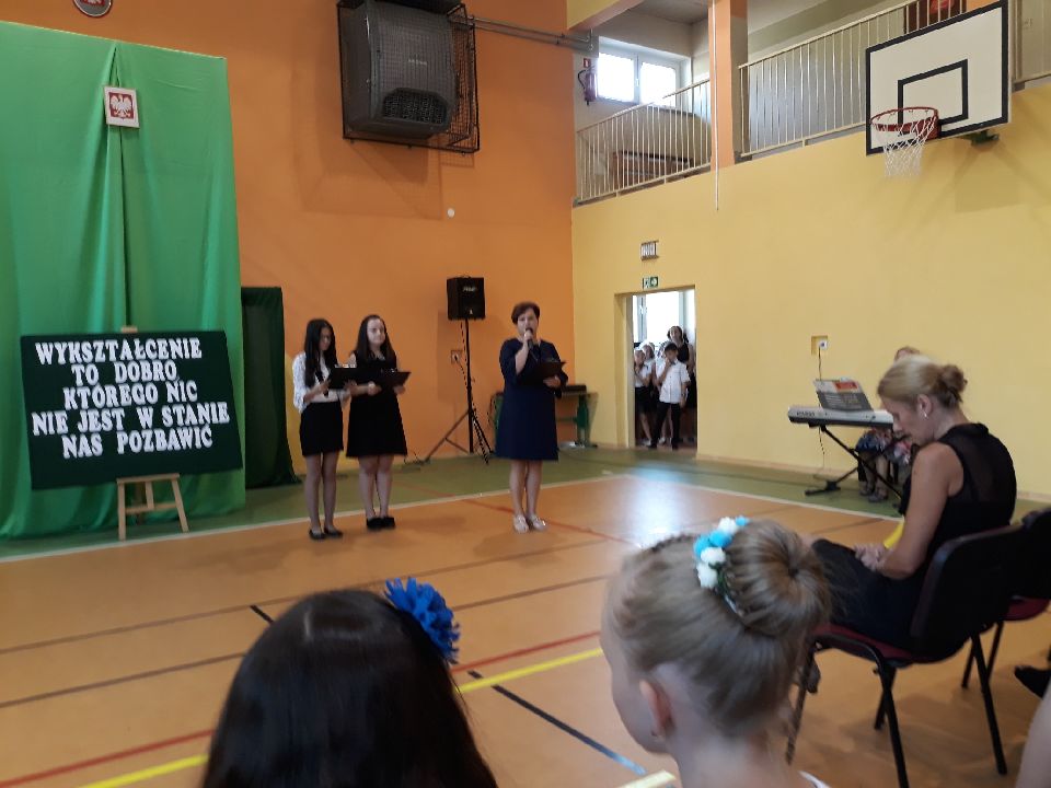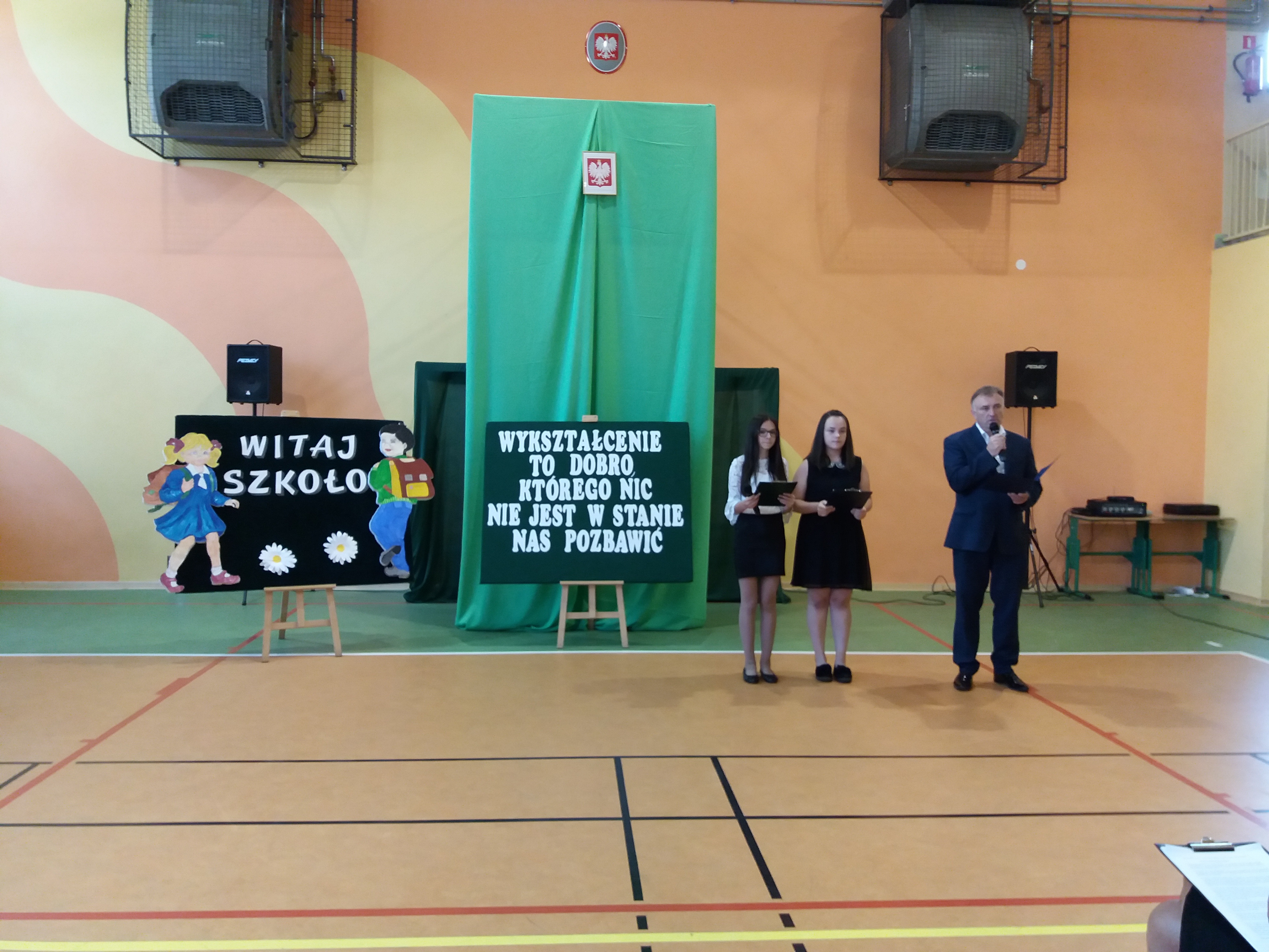 Dalsza jej część miała miejsce w szkolnej sali gimnastycznej, gdzie prowadzący przywitali swoje Koleżanki oraz Kolegów, Dyrekcję Szkoły, Nauczycieli, Rodziców, a także goszczącego w tym dniu w naszej szkole Wójta Gminy Jodłowa Pana Roberta Muchę. Gość zabrał głos i życzył wszystkim powodzenia w nowym roku szkolnym. Życzenia uczniom i nauczycielom złożyła również Pani Dyrektor Aneta Janaś. Następnie uczniowie zaprezentowali się w części artystycznej przygotowanej pod kierunkiem Pań: Jolanty Głaz oraz Marii Serwatki. Oprawą muzyczną występu zajęła się Pani Lena Goleń.
