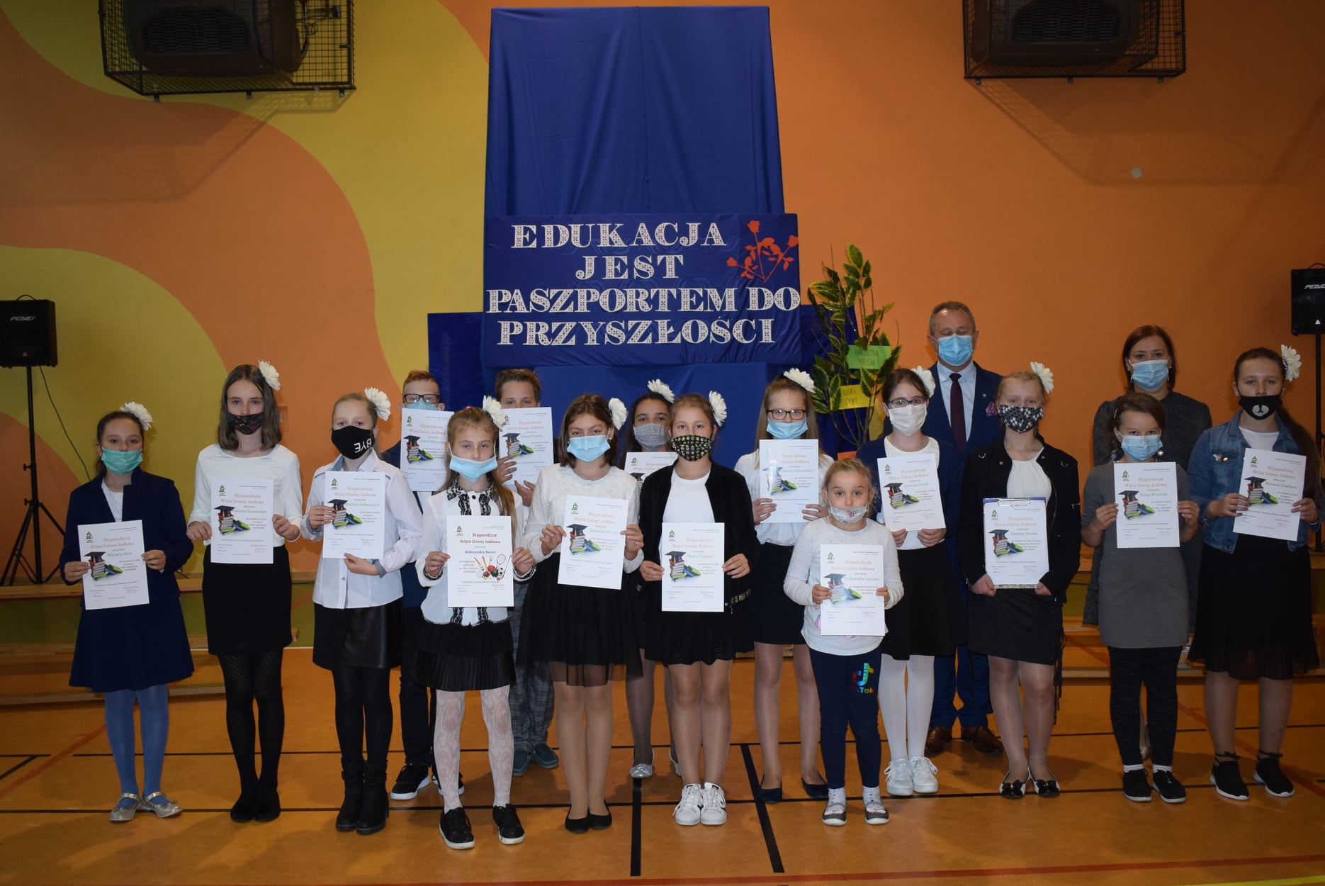 Życzenia w kierunku Grona Pedagogicznego skierował również Pan Wójt, który wręczył uczniom nagrody za wysokie wyniki w nauce i osiągnięcia naukowe, sportowe i artystyczne w roku szkolnym 2019/2020.