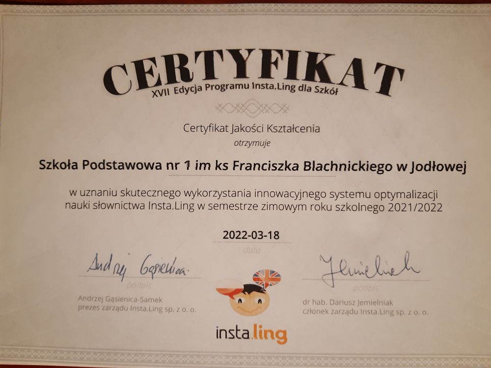 W roku szkolnym 2021/2022 w naszej szkole realizowana jest innowacja pedagogiczna z języka angielskiego i języka polskiego z wykorzystaniem Programu Insta.Ling dla Szkół. Jest to strona WWW do nauki słówek z języka angielskiego oraz ortografii języka polskiego. W programie uczestniczą uczniowie klasy V b i VIII b. Nauka odbywa się w ciekawej formie quizu, który indywidualnie dobiera poziom trudności do aktualnych umiejętności ucznia, dzięki czemu dziecko nie traci czasu na powtórki słówek, które już świetnie zna. Nauczyciel przydziela słówka z przerabianego w szkole materiału, a uczniowie razem z Insta.Ling powtarzają je w domu. Dodatkowym atutem wykorzystania aplikacji jest fakt, że pozwala ona na odsłuchanie wymowy słówek. Dzięki szczegółowym raportom można śledzić systematyczność pracy i stopień opanowania materiału przez uczniów. Dzięki pracy z programem uczniowie zdobywali nowe umiejętności i podnosili poziom posiadanych kompetencji kluczowych, wiedzę zdobywali w sposób kreatywny, poprzez wykorzystanie TIK. Za udział w XVII Edycji Programu Insta.Ling nasza szkoła otrzymała Certyfikat Jakości Kształcenia, przyznawany w uznaniu skutecznego wykorzystania innowacyjnego systemu optymalizacji nauki słownictwa Insta.Ling pod patronatem MEN.