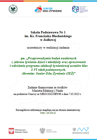 Program MEiN „Junior-Edu-Żywienie” Opublikowano: 01 lipiec 2022 Szkoła Podstawowa Nr 1 im. ks. Franciszka Blachnickiego w Jodłowej została zgłoszona do program MEiN „Junior-Edu-Żywienie” (akronim JEŻ) i potwierdzamy udział w jego realizacji w roku szkolnym 2022/23.