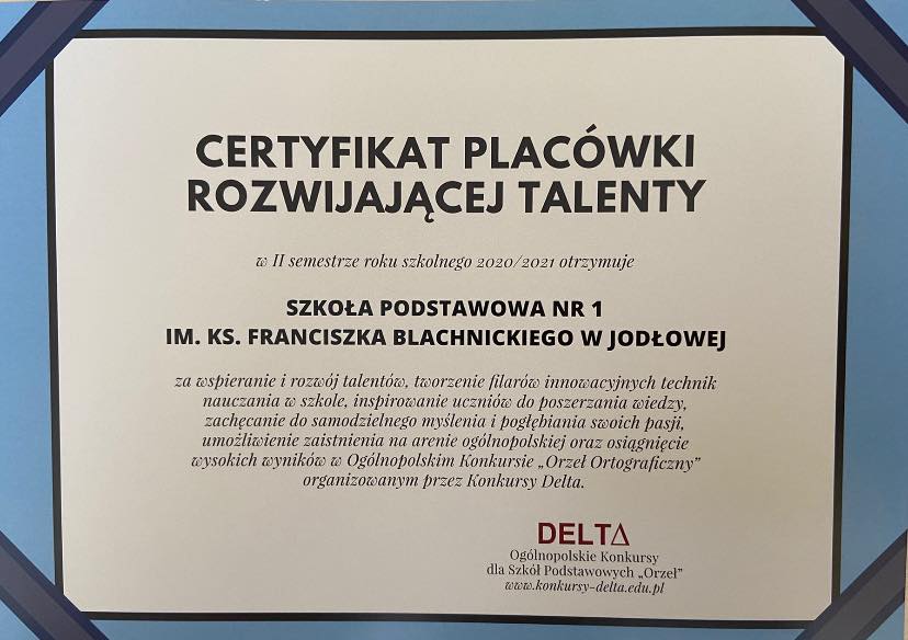 Nasza szkoła otrzymała Certyfikat Placówki Rozwijającej Talenty. Jest to wyróżnienie za wspieranie i rozwój talentów, umożliwienie uczniom zaistnienia na arenie ogólnopolskiej oraz osiągnięcie wysokich wyników w Ogólnopolskich Konkursach.