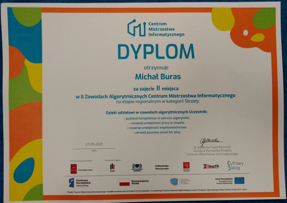 W roku szkolnym 2020/2021 w naszej szkole realizowany był projekt Centrum Mistrzostwa Informatycznego, w ramach którego uczniowie brali udział w zajęciach informatycznych z zakresu algorytmiki i programowania w języku Scratch. Za nami bardzo pracowity rok szkolny. Pomimo czasu pandemii i nauczania zdalnego udało się uczniom naszej szkoły dotrzeć do finału II Ogólnopolskich Zawodów Algorytmicznych w projekcie Centrum Mistrzostwa Informatycznego.