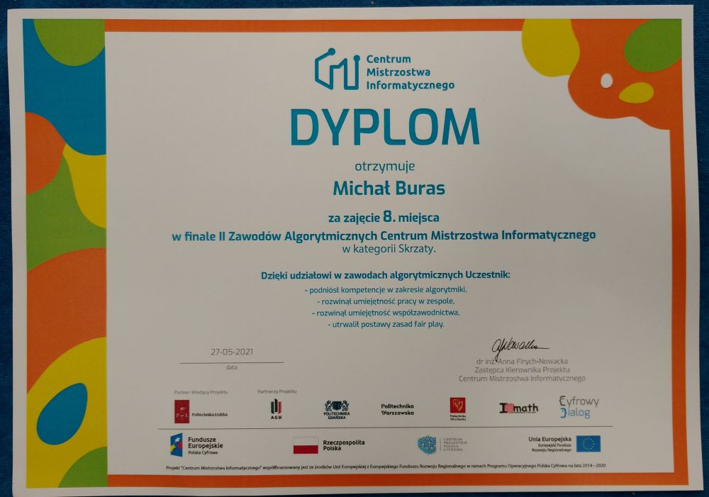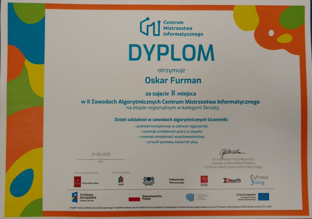 Gratulujemy Michałowi i Oskarowi za ich zapał do programowania, za osiągnięte sukcesy, za pasję do rozwijania wiedzy algorytmicznej, a przede wszystkim za to, że dotarli do finału II Ogólnopolskich Zawodów Algorytmicznych w projekcie Centrum Mistrzostwa Informatycznego. Niech programowanie będzie dla Michała i Oskara drogowskazem w osiągnięciu celu w życiu, a jednocześnie stanie się cennym i unikalnym kapitałem, który umożliwi im budowanie przewagi konkurencyjnej w świecie, gdyż funkcjonowanie współczesnego świata oparte jest na wykorzystaniu technologii teleinformatycznych.