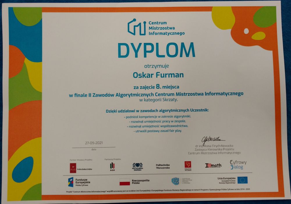 Uczniowie klasy szóstej: Michał Buras i Oskar Furman zostali finalistami II Ogólnopolskich Zawodów Algorytmicznych w projekcie Centrum Mistrzostwa Informatycznego. Znaleźli się w pierwszej ósemce najlepszych zespołów w Polsce w zakresie wiedzy programistycznej.Należy podkreślić, że uczniowie rywalizowali z zespołami z klas siódmych i ósmych, co potwierdza ich ogromną wiedzę programistyczną.Choć nie udało się uzyskać tytułu laureata, to wiedza, jaką osiągnęli, jest godna podziwu, a uzyskany wynik to niebywały sukces i osiągnięcie.