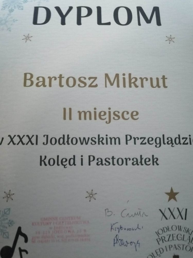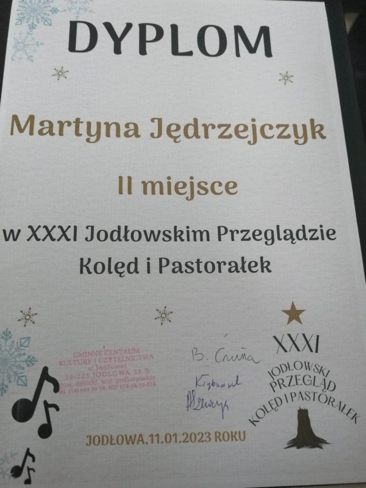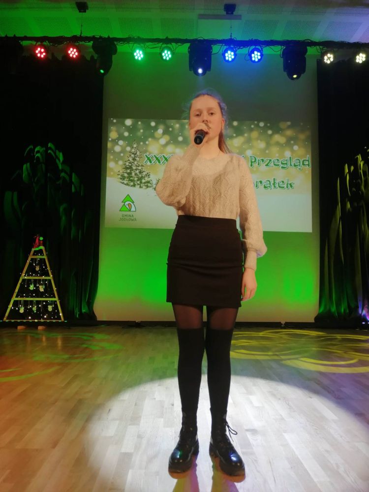 Kategoria III (kl. 5-8) – II miejsceMartyna Jędrzejczyk (kl.8). Martyna zaprezentowała się ze współczesną piosenką bożonarodzeniową „Noel”.