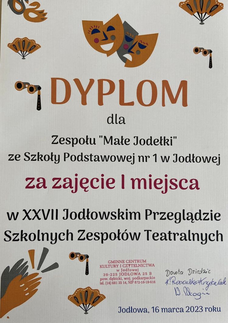 I miejsce dla zespołu "Małe Jodełki" Opublikowano: 16 marzec 2023 I miejsce dla zespołu "Małe Jodełki" w XXVII Jodłowskim Przeglądzie Szkolnych Zespołów Teatralnych. Gratulujemy!!! Podziękowania dla uczniów i nauczycieli. Występ naszych uczniów na Przeglądzie Teatrzyków: https://fb.watch/jjblx07UH4/