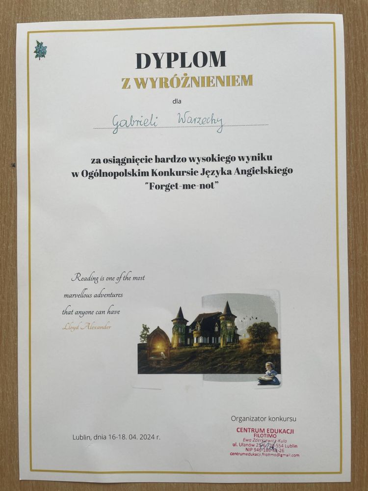 Uczniowie naszej szkoły uzyskali bardzo wysokie wyniki a Gabriela Warzecha zdobyła wyróżnienie.