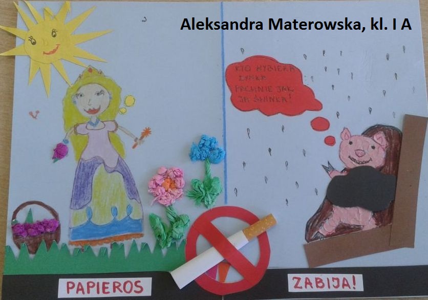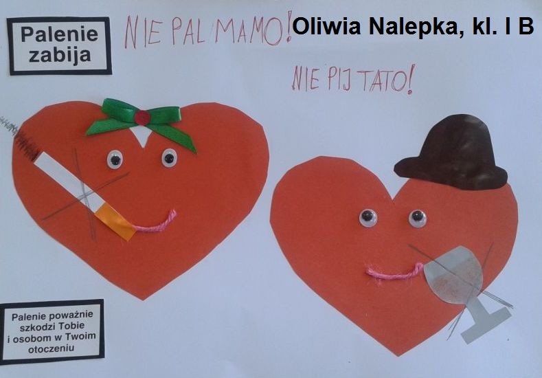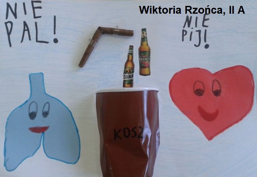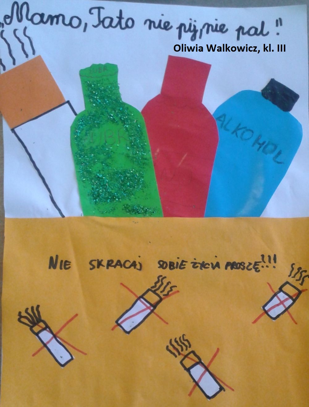 Konkurs „Stop uzależnieniom – mamo, tato, nie pij, nie pal!” został przeprowadzony w Szkole Podstawowej wśród uczniów klas I – III. Celem konkursu była promocja zdrowego stylu życia, trzeźwości i abstynencji przez upowszechnianie wzorów i postaw prozdrowotnych, jak również rozwijanie wyobraźni plastycznej i twórczej wśród uczniów. Z pośród złożonych prac zostały wyłonione następujące prace uczniów: