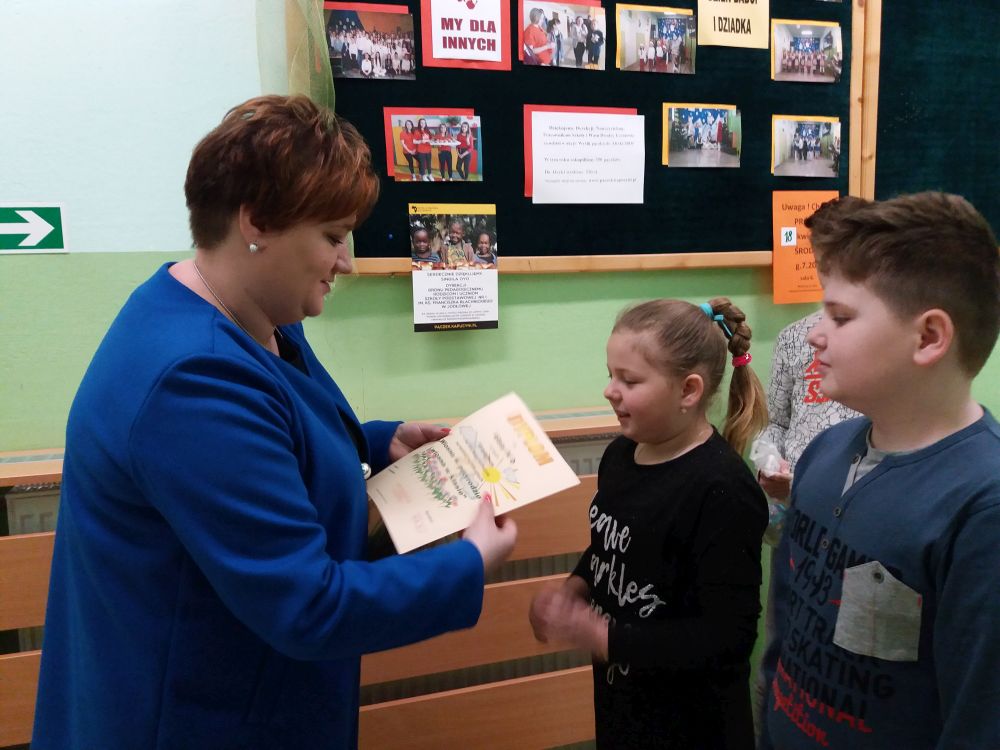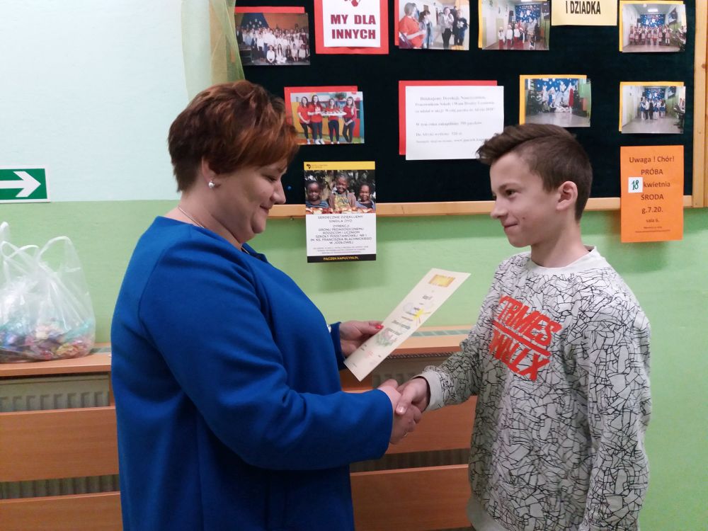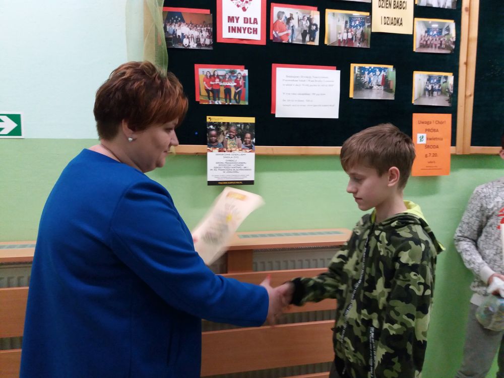 Przewodniczący klas odebrali dyplomy i nagrody, które wręczyła Pani Dyrektor mgr Aneta Janaś.