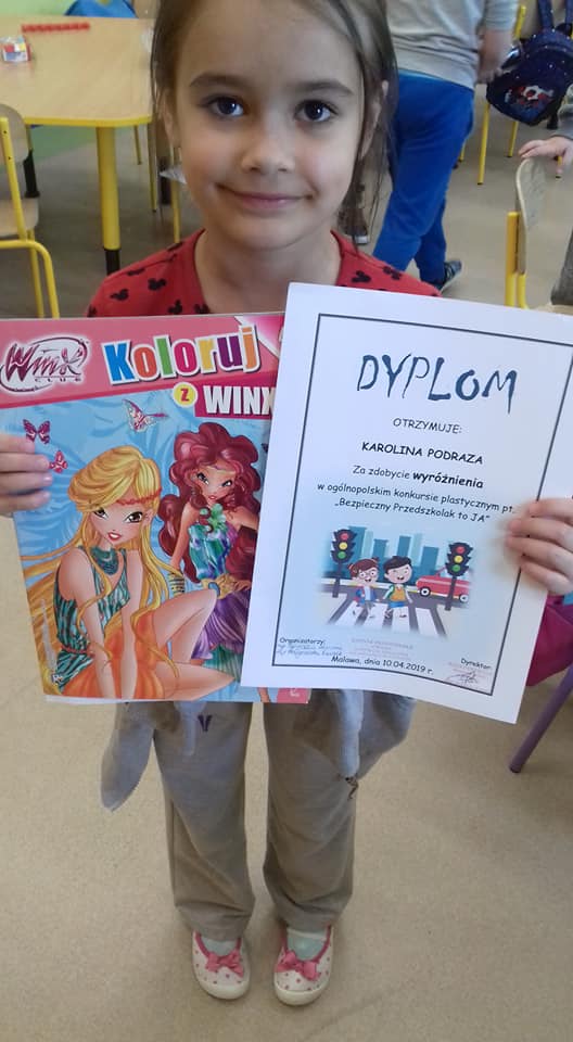 Karolinka Podraza, Sandra Klusek i Ola Latocha wzięły udział w Ogólnopolskim Konkursie Plastycznym pod hasłem "Bezpieczny przedszkolak" dotyczącym zasad bezpiecznego zachowania się w drodze do przedszkola. Karolinka została wyróżniona, co jest niemałym osiągnięciem, bo udział brało 178 przedszkolaków z całej Polski. Ola i Sandra dostały dyplomy za udział
