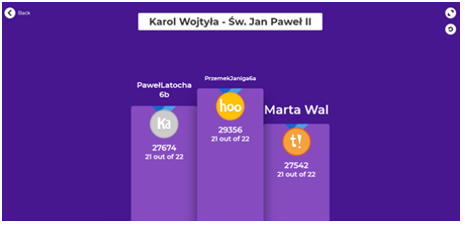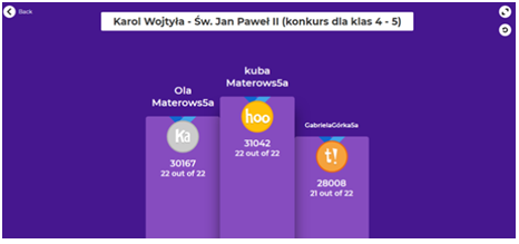 W dniu 25 maja 2020 r. uczniowie naszej szkoły wzięli udział w konkursie dotyczącym życia i działalności Karola Wojtyły – św. Jana Pawła II. Konkurs został zorganizowany na platformie internetowej Kahoot. W grze wzięło udział 42 osoby w starszej grupie wiekowej i 16 osób w młodszej. Uczniowie odpowiadali na 22 pytania. Liczyła się poprawność odpowiedzi i czas reakcji. Wśród uczniów klas IV-V dwie osoby nie popełniły błędu, a średnia poprawnych odpowiedzi wyniosła 82,7%. Najlepszy wynik - 31 042 punkty.