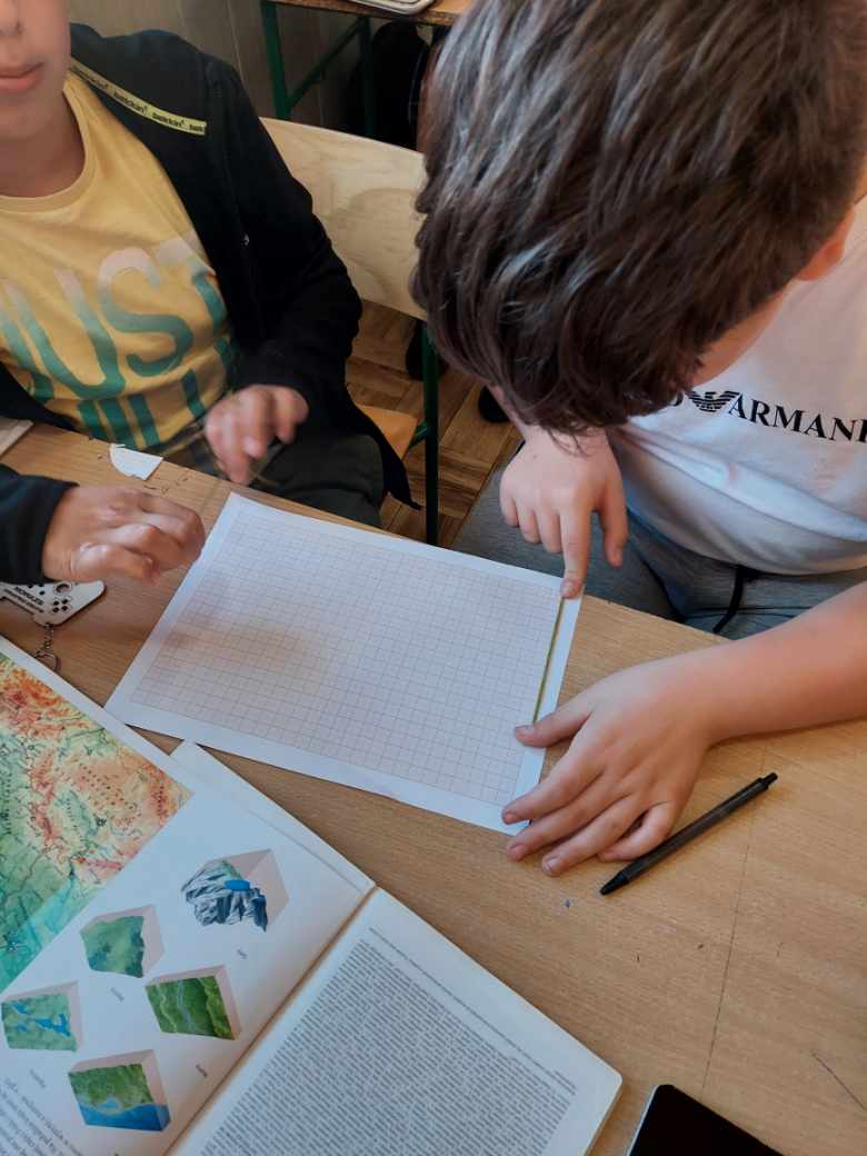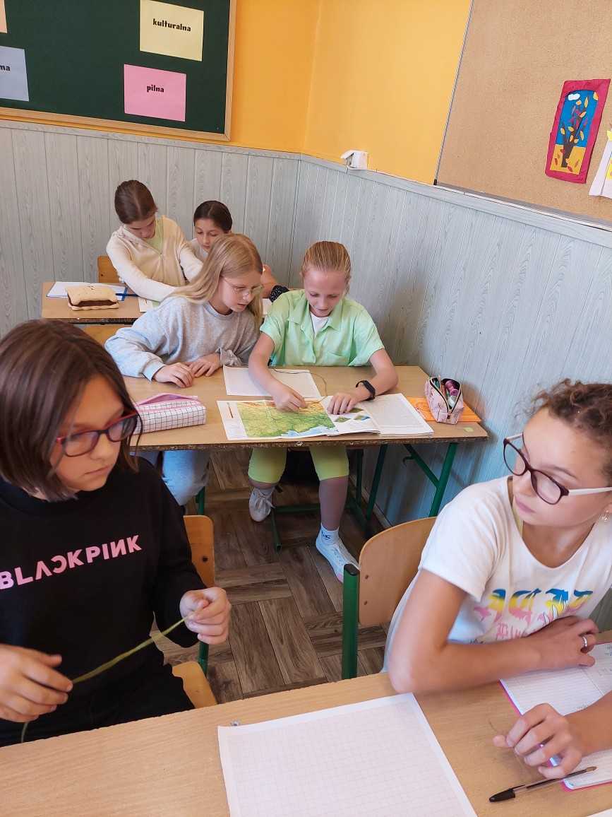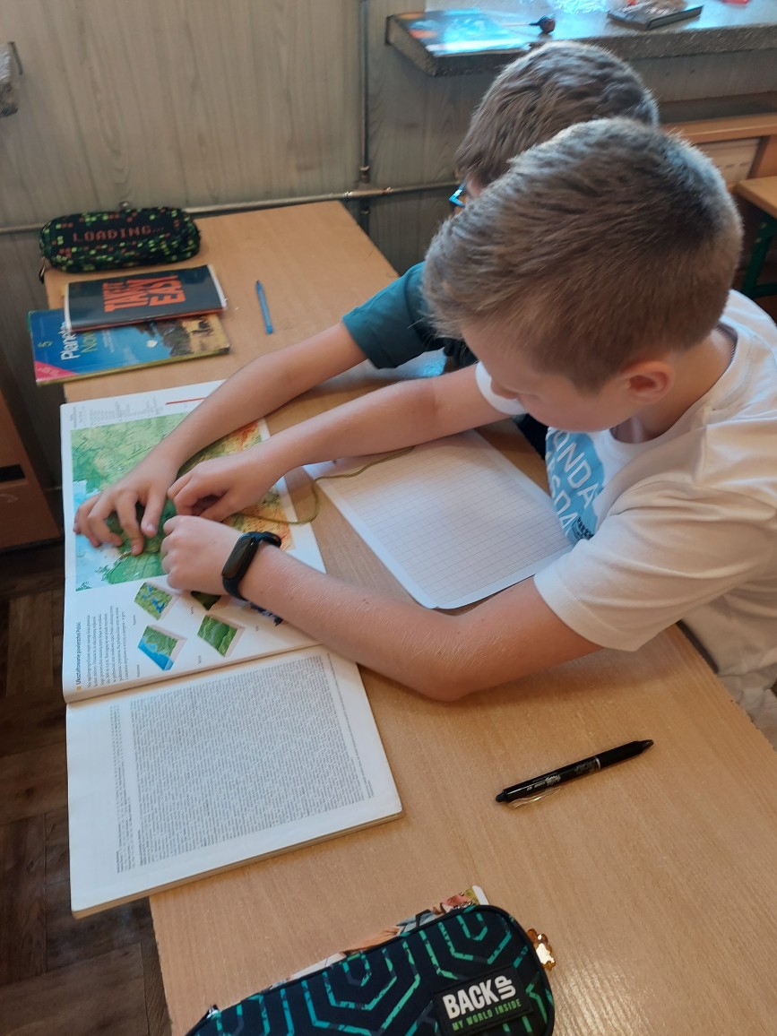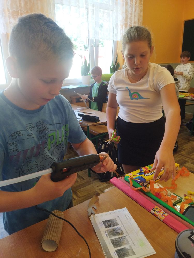 Uczniowie klasy 5b w trakcie zajęć techniki wykonywali drzewo z papieru - przyklejali klejem na gorąco elementy, aby zbudować drzewo przestrzenne w formacie 3D. Z kolei na geografii wykorzystywali papier milimetrowy oraz nici do mierzenia odległości zapisanych drogą krętą.