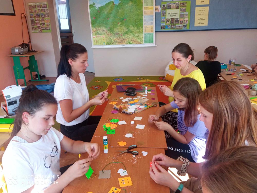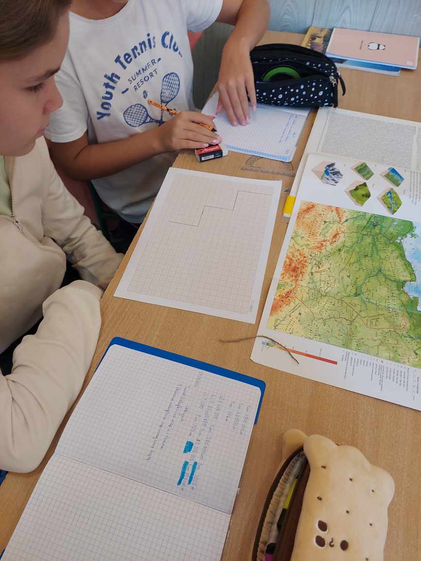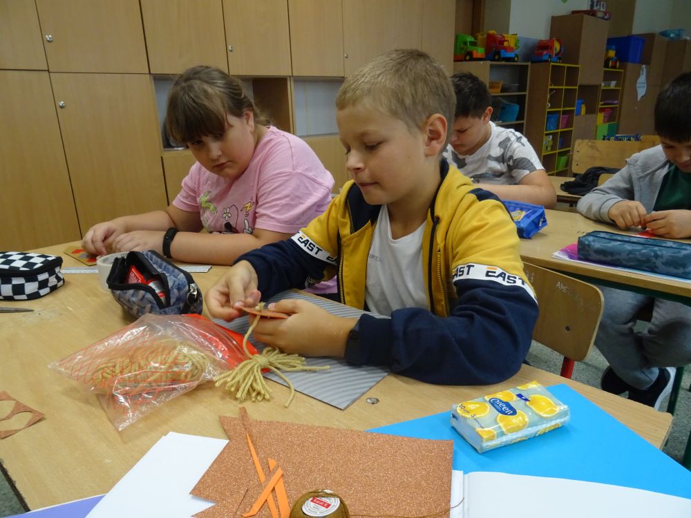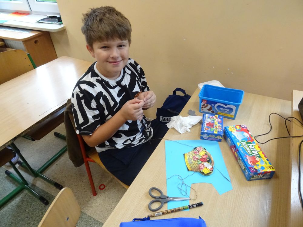 Uczniowie klasy 5b w trakcie zajęć techniki wykonywali drzewo z papieru - przyklejali klejem na gorąco elementy, aby zbudować drzewo przestrzenne w formacie 3D. Z kolei na geografii wykorzystywali papier milimetrowy oraz nici do mierzenia odległości zapisanych drogą krętą.