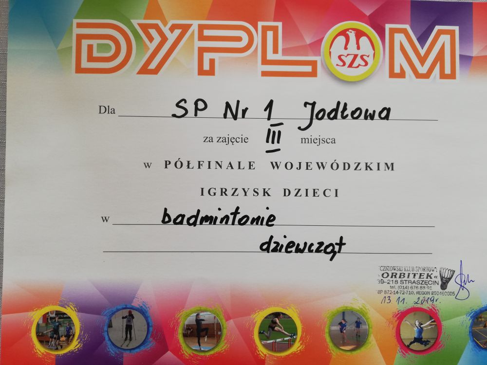 Sukcesem zakończył się udział reprezentacji dziewcząt w Półfinale Wojewódzkim Igrzysk Dzieci w Badmintonie, który odbył się w 13 listopada w Straszęcinie. Drużyna z Jodowej zajmując III miejsce wywalczyła awans do finału wojewódzkiego. Nasza szkoła walczyła w składzie: Weronika Baran, Milena Górka, Aleksandra Baran, opiekun – Stanisław Górka.