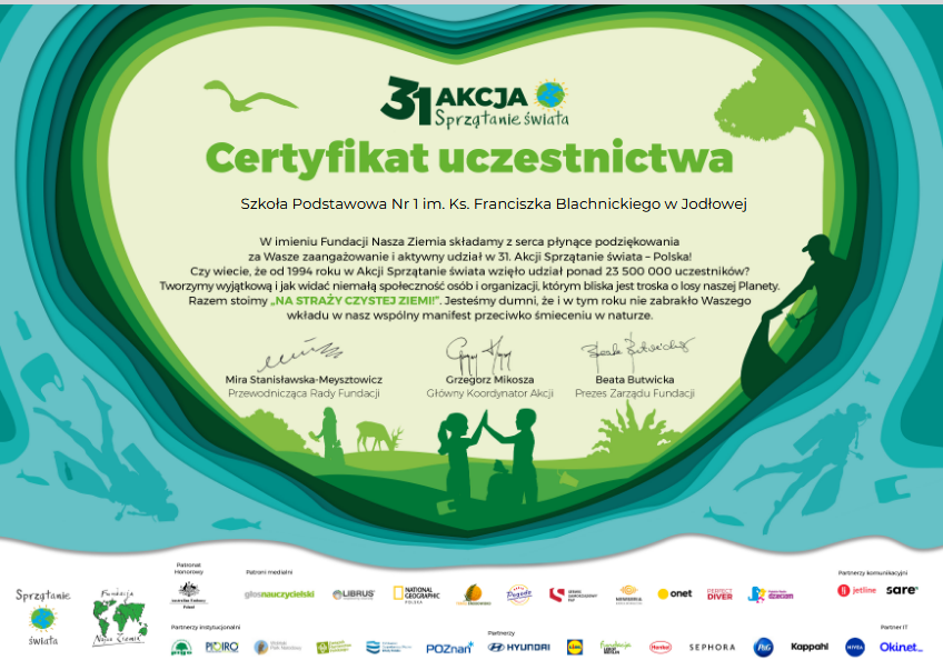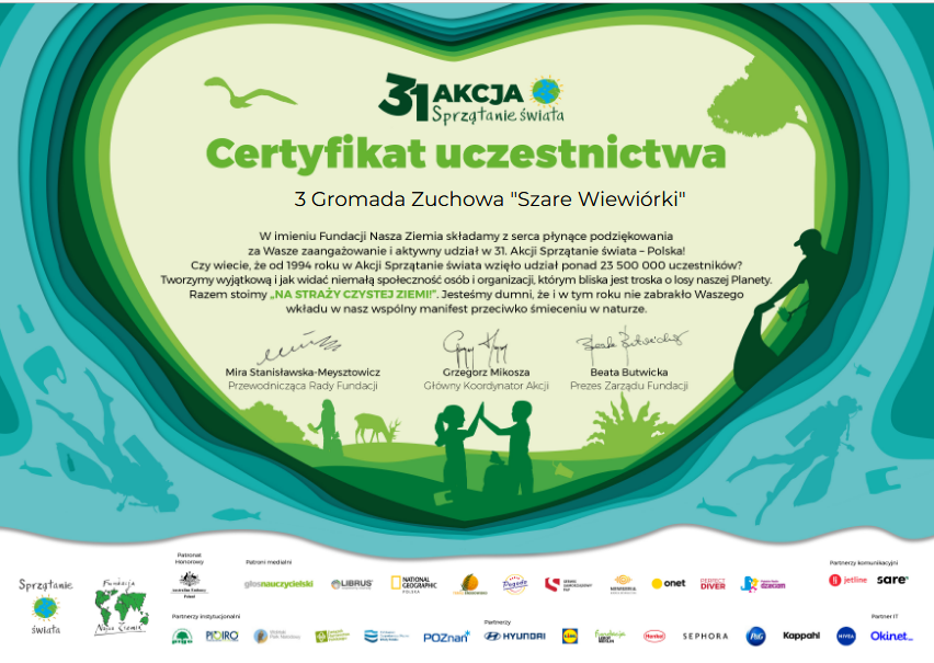 Certyfikat dla szkoły i zuchów Opublikowano: 15 październik 2024 Nasza szkoła i 3 Gromada Zuchowa "Szare wiewiórki" otrzymały CERTYFIKAT za zaangażowanie i aktywny udział w akcji "Sprzatanie świata" .