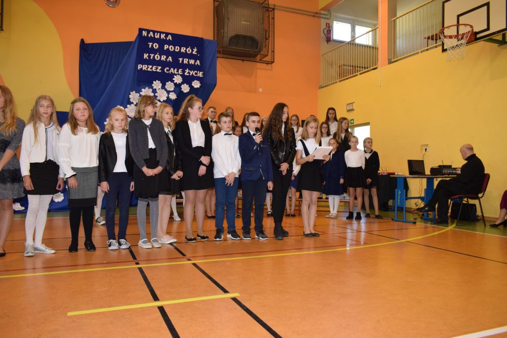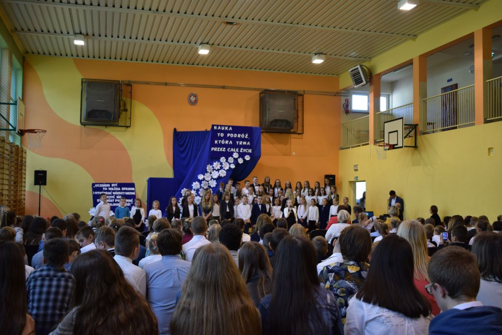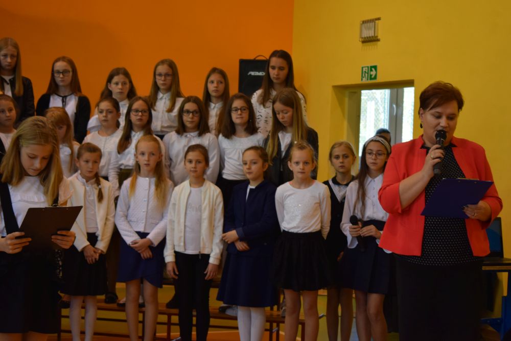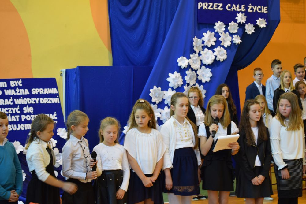 Uroczyste spotkanie rozpoczęło wystąpienie Pani Dyrektor Anety Janaś, która powitała wszystkich zebranych. Następnie odbyła się część artystyczna przygotowana przez uczniów pod kierunkiem pań M. Warzechy, M. Serwatka i J. Głaz. O oprawę muzyczną zadbała p. L. Goleń wraz z chórem szkolnym. Młodzi artyści piosenką i słowem wyrazili swoją wdzięczność za codzienny trud pracy nauczyciela, jego poświęcenie, pomocną dłoń oraz przewodnictwo w drodze do zdobywania wiedzy. Po części artystycznej przedstawiciele Samorządu Szkolnego złożyli życzenia Dyrekcji oraz Gronu Pedagogicznemu.