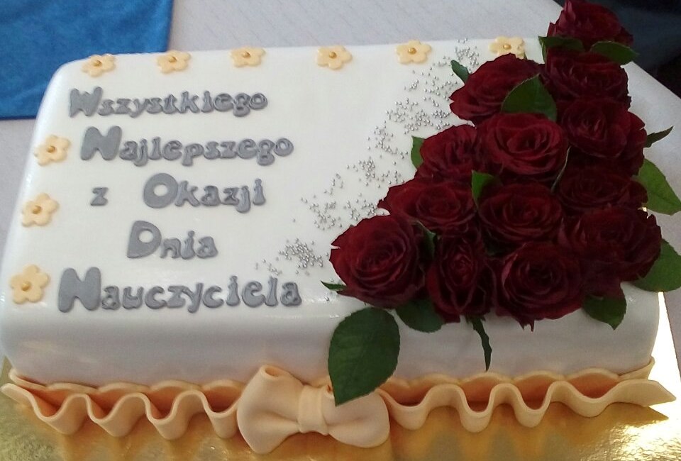 Nie zbrakło również życzeń od Rodziców, którzy złożyli słodki poczęstunek - w postaci pieknego torta dla nauczycieli i pracowników szkoły.