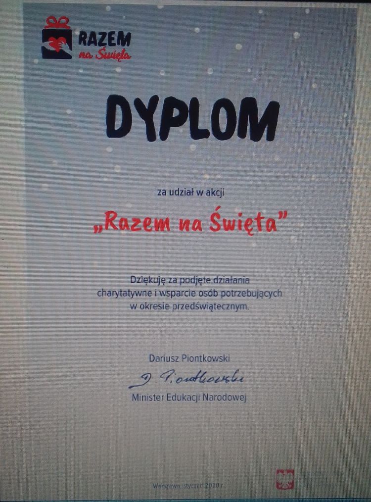w imieniu Ministra Edukacji Narodowej Dariusza Piontkowskiego bardzo serdecznie dziękuję za włączenie się do naszej akcji „Razem na Święta”. Inicjatywa miała na celu zachęcenie uczniów do działań charytatywnych i wsparcia osób potrzebujących w okresie przedświątecznym.