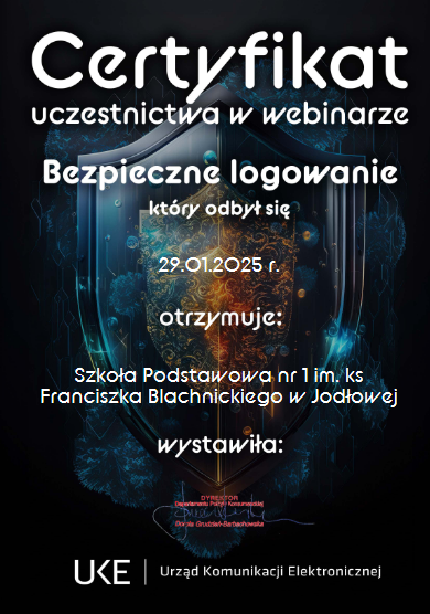 "Loguj się bezpiecznie" Opublikowano: 06 luty 2025 Certyfikat potwierdzający uczestnictwo uczniów klas IV-VI w webinarze "Loguj się bezpiecznie".