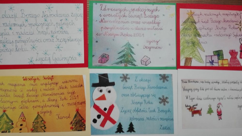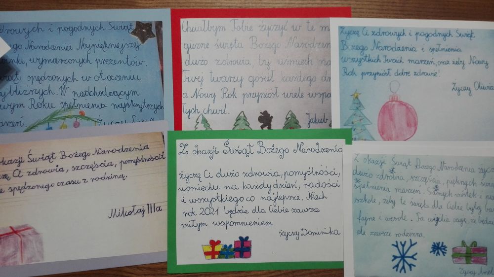 W związku z sytuacją epidemiczną i nauką prowadzoną w trybie online życzenia świąteczne przygotowały tylko dzieci z klasy III a pod kierunkiem p. Anety Rusztowicz (a nie cała 3 Gromada Zuchowa). Ich życzenia zostały wydrukowane i naklejone na pocztówki wykonane przez p. Barbarę Wójcik w programie do tworzenia grafik online Canva. Nasze kartki zostały wysłane do Krakowa. A my teraz cierpliwie czekamy na prace wykonane przez naszych kolegów…